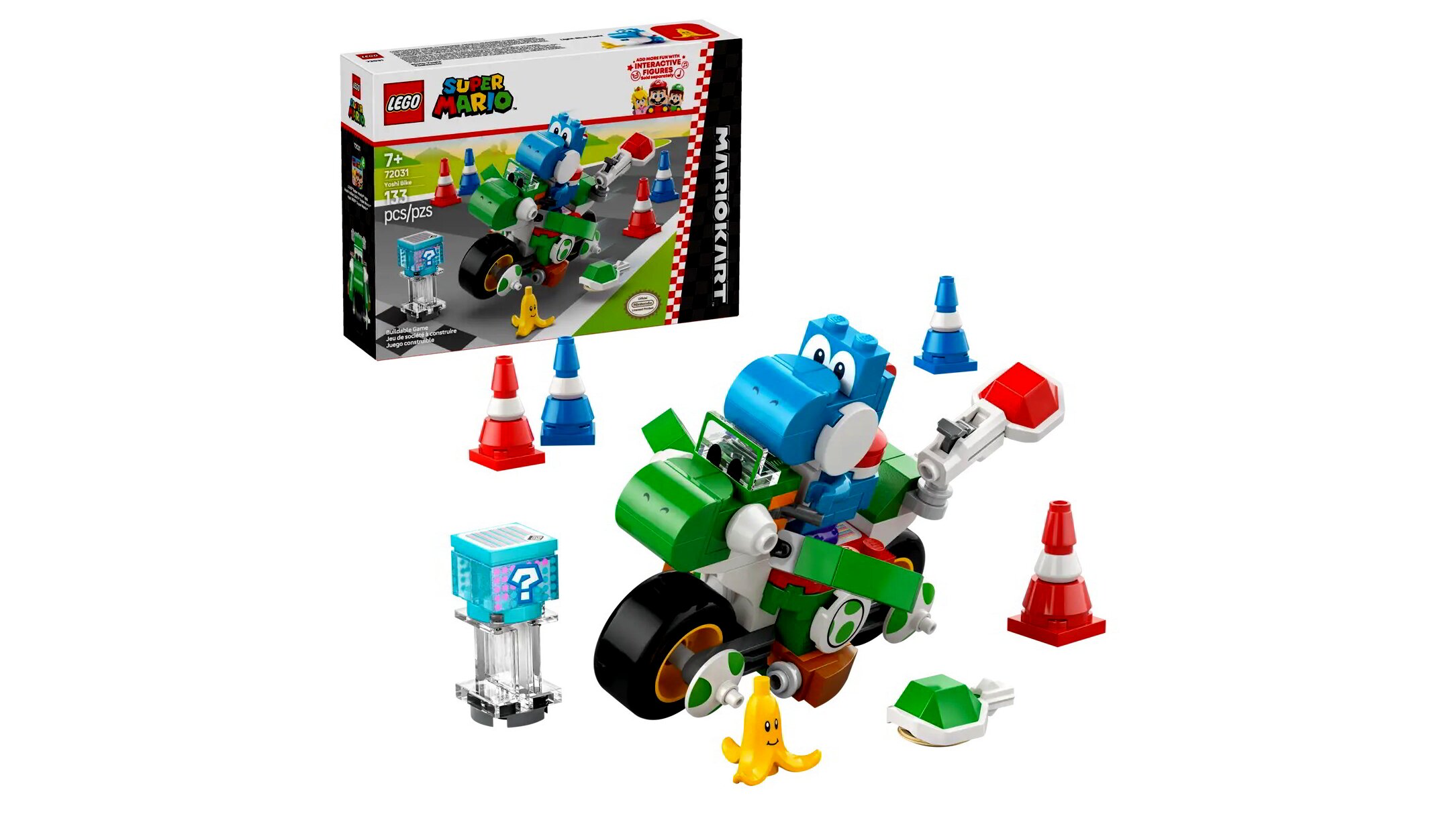 - 🚗 Részletes Yoshi figurával: A készlet tartalmazza Yoshi-t a motoros járműjével, amely a Mario Kart játékok ikonikus szereplője.