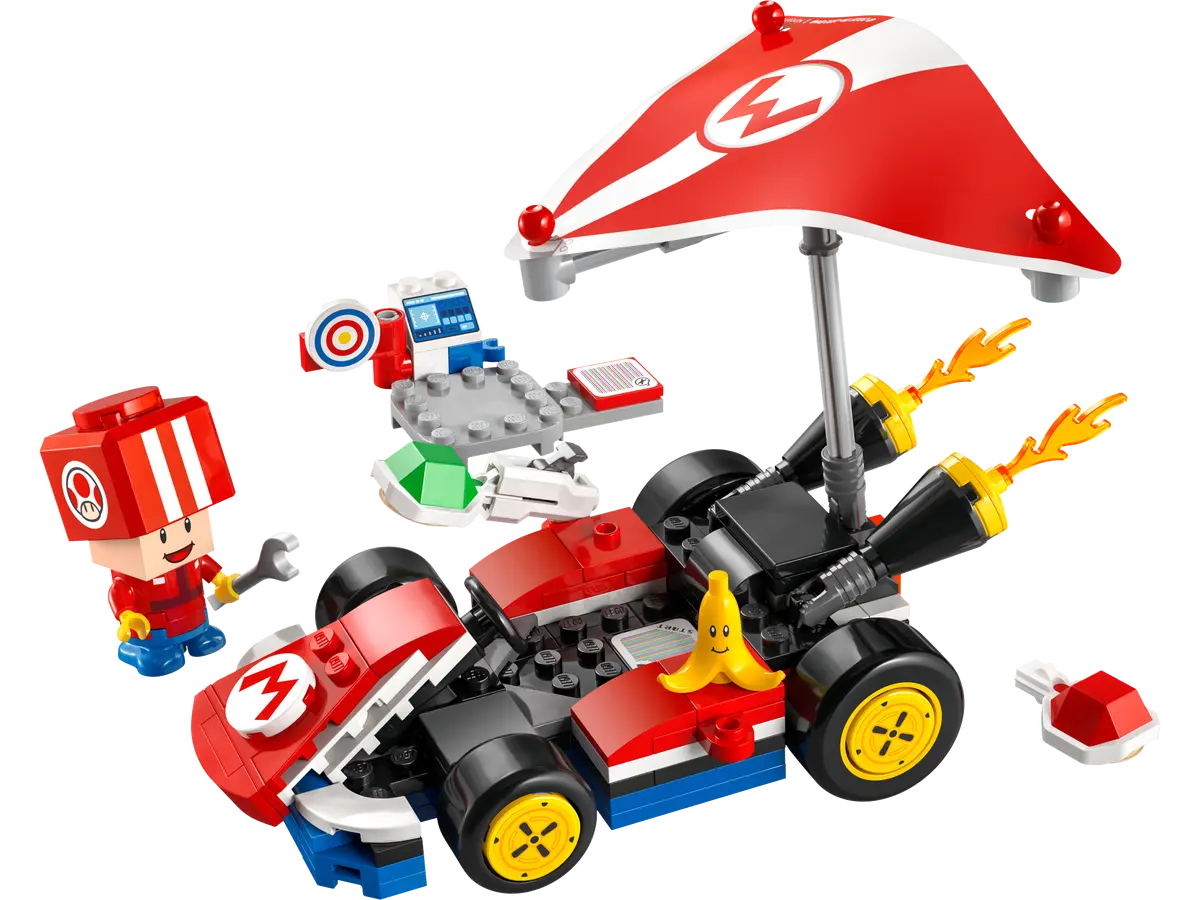 Készlet összetevői: Standard Kart megépíthető modell, munkaállomás céltáblával, Toad (Pit Crew) figura, Banana figura