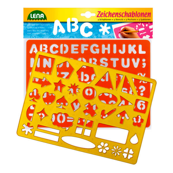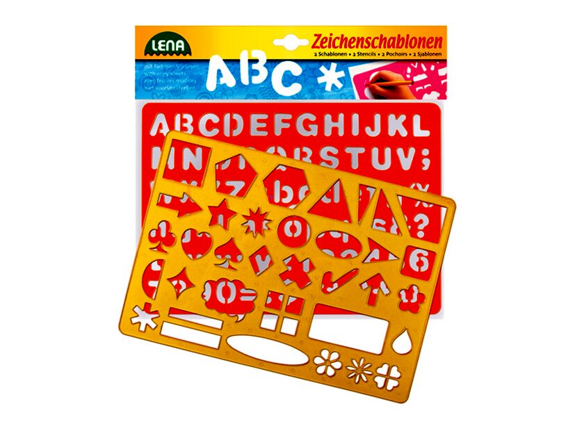 A 2 db-os rajzolósablon - betűk, számok, formák sablonokon 110 féle különböző kis- és nagybetűt, számot, műveleti jelet, különböző mintákat - négyzetet, háromszöget, rombuszt, de virágokat, napot, esőcseppet, és bowling golyót is - találsz. A sablonok átmérője 26 cm, csomagolási méretek: 27 x 19 cm.