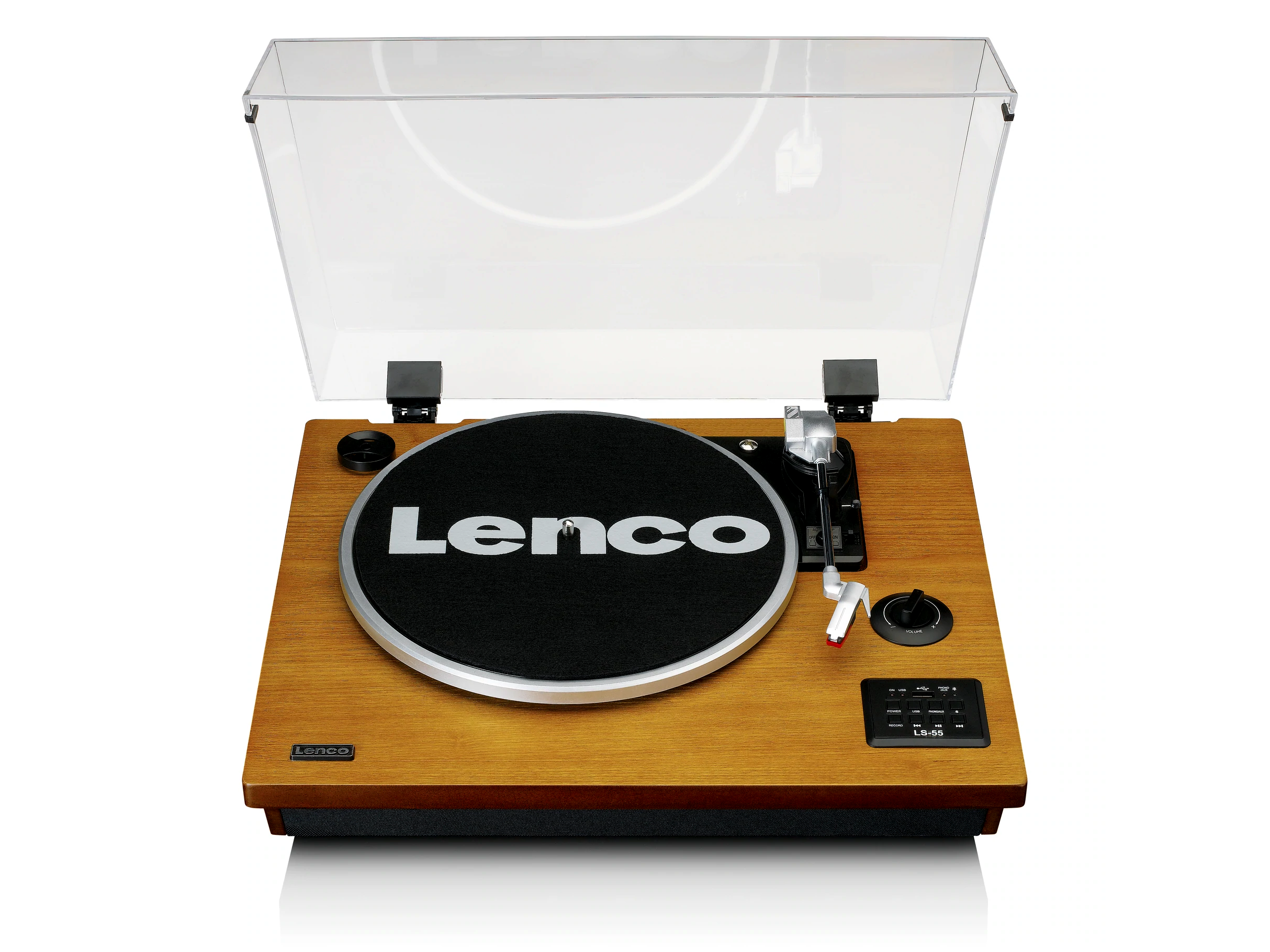 Az LS-55 egy gyönyörű fából készült lemezjátszó beépített sztereó hangszórókkal.