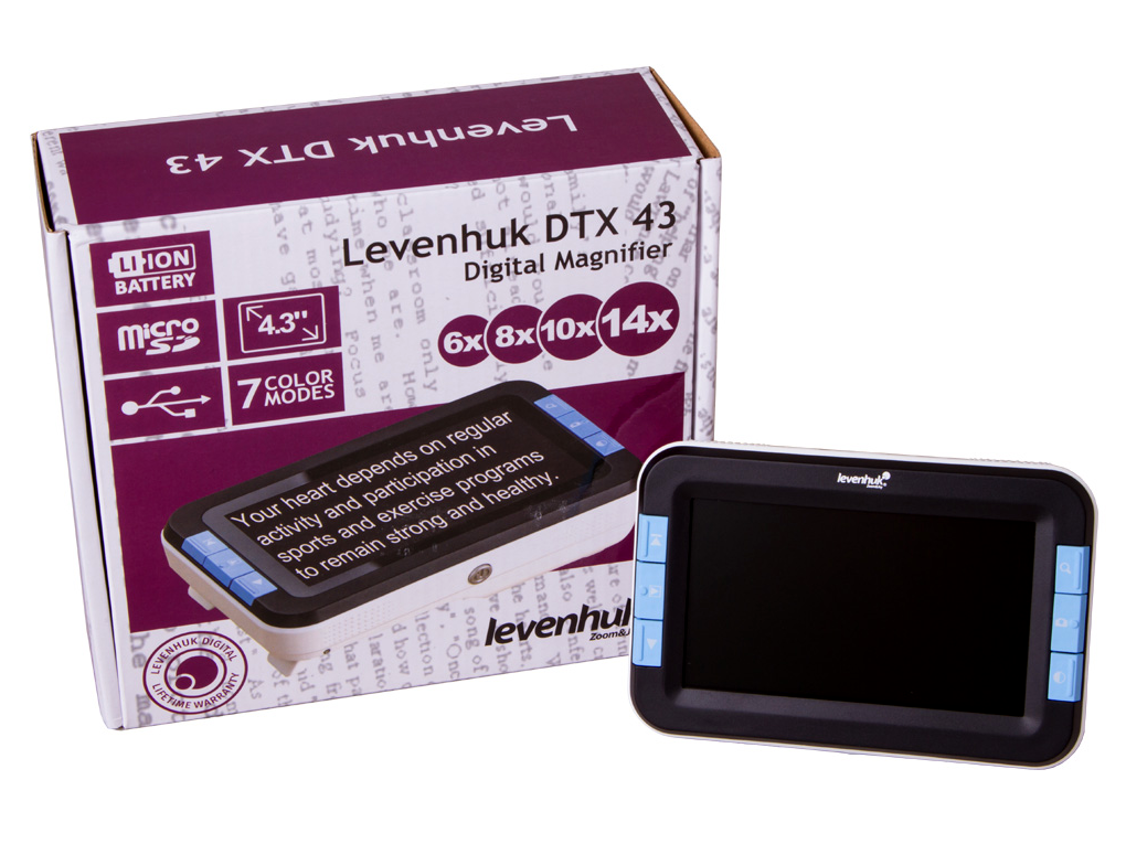 A Levenhuk DTX 43 digitális nagyító egy modern eszköz csökkent látóképességűek számára vagy azoknak, akik kisbetűs szövegekkel és kis képekkel dolgoznak. Négy fix nagyítást biztosít 6x és 14x közötti tartományban, és LED-világítással van ellátva, ami lehetővé teszi, hogy tisztán láthassa a képet a képernyőn, még teljes sötétségben is. Ezenkívül hét színes mód áll rendelkezésre. Olvashatja a szöveget egy beépített LCD-képernyőn vagy egy külső képernyőn. Az eszköz USB vagy HDMI-kábel segítségével csatlakoztatható számítógéphez vagy televízióhoz. Az eszköz lehetővé teszi képek készítését olvasás közben, majd ezeket a képeket elmentheti a csatlakoztatott számítógép merevlemezére vagy egy telepített memóriakártyára.