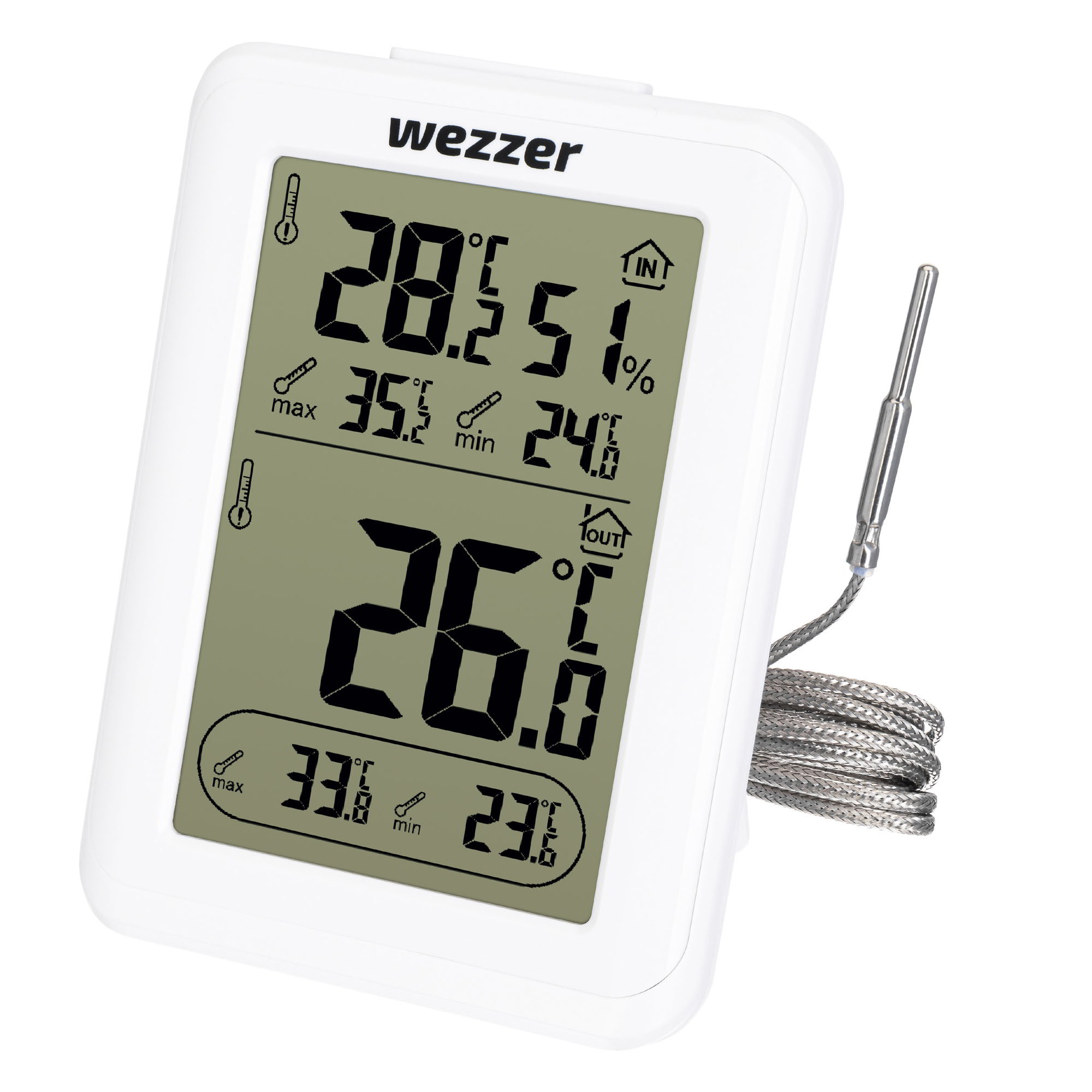 A Levenhuk Wezzer SN10 terméket úgy tervezték meg, hogy a szauna léghőmérsékletét lehessen megmérni vele. A berendezésnek van egy fő egysége, amelyen kijelző is található. Ezt az öltözőben kell elhelyezni, a vezetékes hőszondát a 3 méteres kábellel pedig bevezetni a gőzkabinba. A berendezés a gőzkabin felfűtését is segíti, valamint monitorozza, hogy a társalgó mikroklímája biztonságos és kényelmes érzetet nyújt-e. A fő egység többféleképpen is elhelyezhető: lehet asztali (kisméretű, szétnyitható asztali állványon) vagy falra szerelt (önmetsző csavarokkal rögzítve). Javasoljuk, hogy a gőzkabinba a hőszondát a talajtól kissé elemelve telepítse. Az értékek a hőmérő kijelzőjéről olvashatók le: a berendezés világos, kontrasztos számjegyeket jelenít meg. Szükség szerint a háttérfény is bekapcsolható. A kijelző tetején láthatók a fő egység értékei, alul pedig a hőszonda által mért értékek. Az aktuális hőmérséklet mellett mindkét egység megmutatja a minimális és maximális értékeket is. Ezenfelül a fő egység a levegő páratartalmát is méri. Az eszköz standard elemekkel működik.