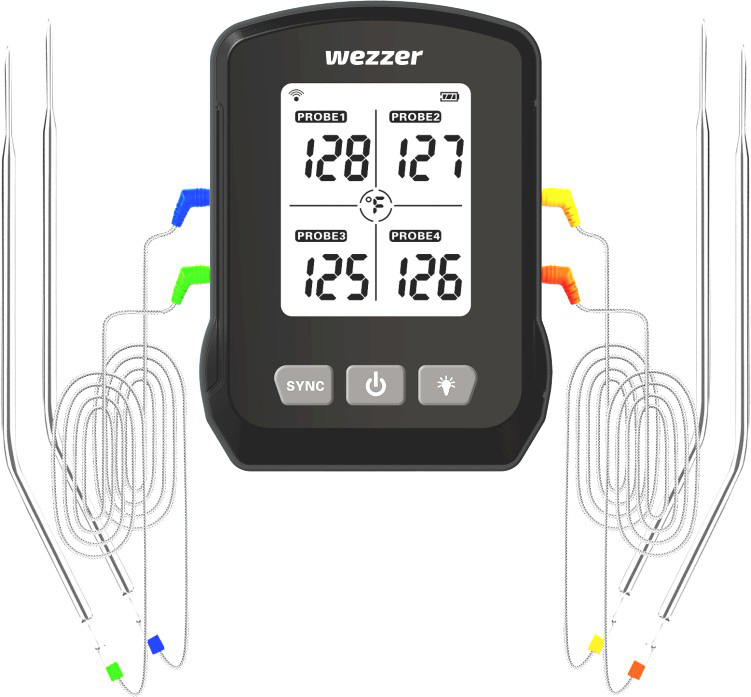 A Levenhuk Wezzer Cook MT90 a főzési/sütési hőmérők továbbfejlesztett típusa; négy szondával láttuk el. Az egyes hőszondák 1 méter hosszú, rugalmas kábelvezetékhez csatlakoznak. Az eszköz egyszerre több készülő étel hőmérsékletét is képes megmérni, függetlenül attól, hol van az étel: a sütőben, a tűzhelyen vagy éppen a grillen. A adatok jól látható módon jelennek meg a beépített képernyőn: A számjegyek nagy méretűek, kontrasztosak; beépített háttérvilágítás is található rajta.