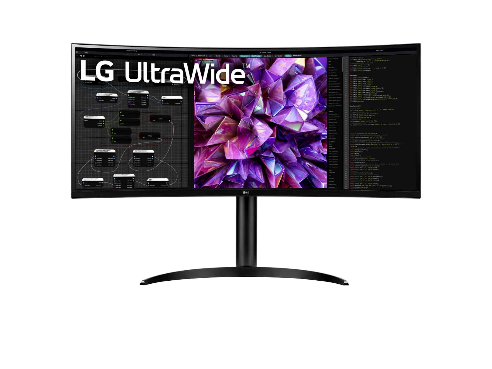 Az UltraWide™ QHD képernyő (3440x1440 felbontás, 21:9 képarány) kiválóan alkalmas a munkához, mivel egyszerre több programot is képes megjeleníteni.