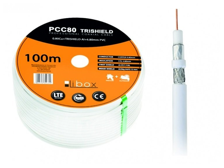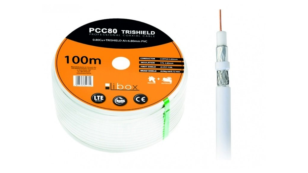 PCC80 - koaxiális kábel 0,8 mm vastag rézvezetővel, ami biztosítja a legjobb jeláramlást. A kábel kültéri és beltéri antennaberendezések építésére szolgál. A terméket emellett háromszoros árnyékolás is jellemzi, ami megvédi a jelet a környezet nem kívánt interferenciáitól. Kollektív telepítéseknél használatos.