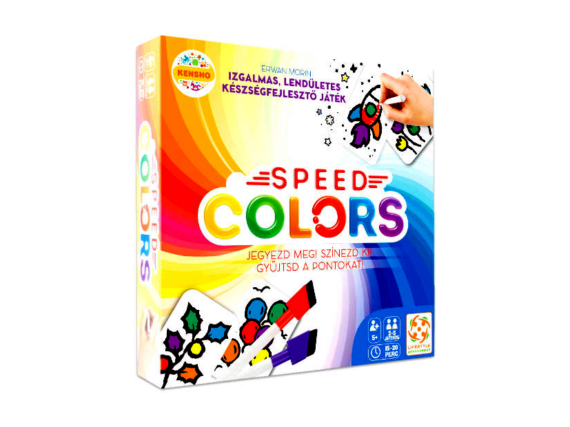 A Speed Color társasjáték célja, hogy te legyél a legügyesebb festőművész. A társasjáték során meg kell jegyezni a kihúzott kártya színes oldalán lévő képet, majd meg kell fordítani a kártyát és a fekete-fehér képet úgy kell kiszínezni, ahogy a másik oldalán volt a lehető leggyorsabban. Színezz te a leggyorsabban és a legpontosabban a fordulók során és nyerd meg te a játékot! Csomagolási méretek: 27 x 27 x 6 cm.