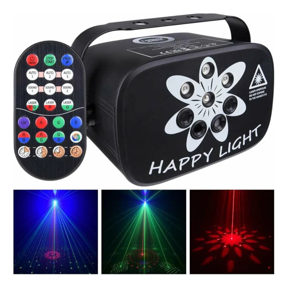 • Többféle effekt egyben: RGB + UV LED, piros–zöld (RG) lézer, statikus és animált minták
