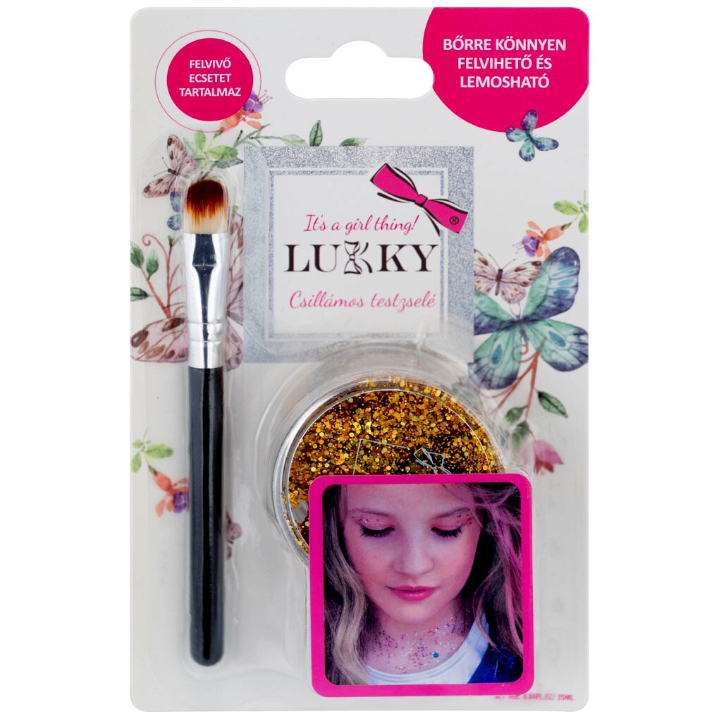 A Lukky csillámos testzselével a lányok egyszerűen és gyorsan varázsolhatnak maguknak csillámos bőrt. Használata könnyű, az ecset segítségével tudják a zselét felvinni a felületekre. Könnyedén lemosható.