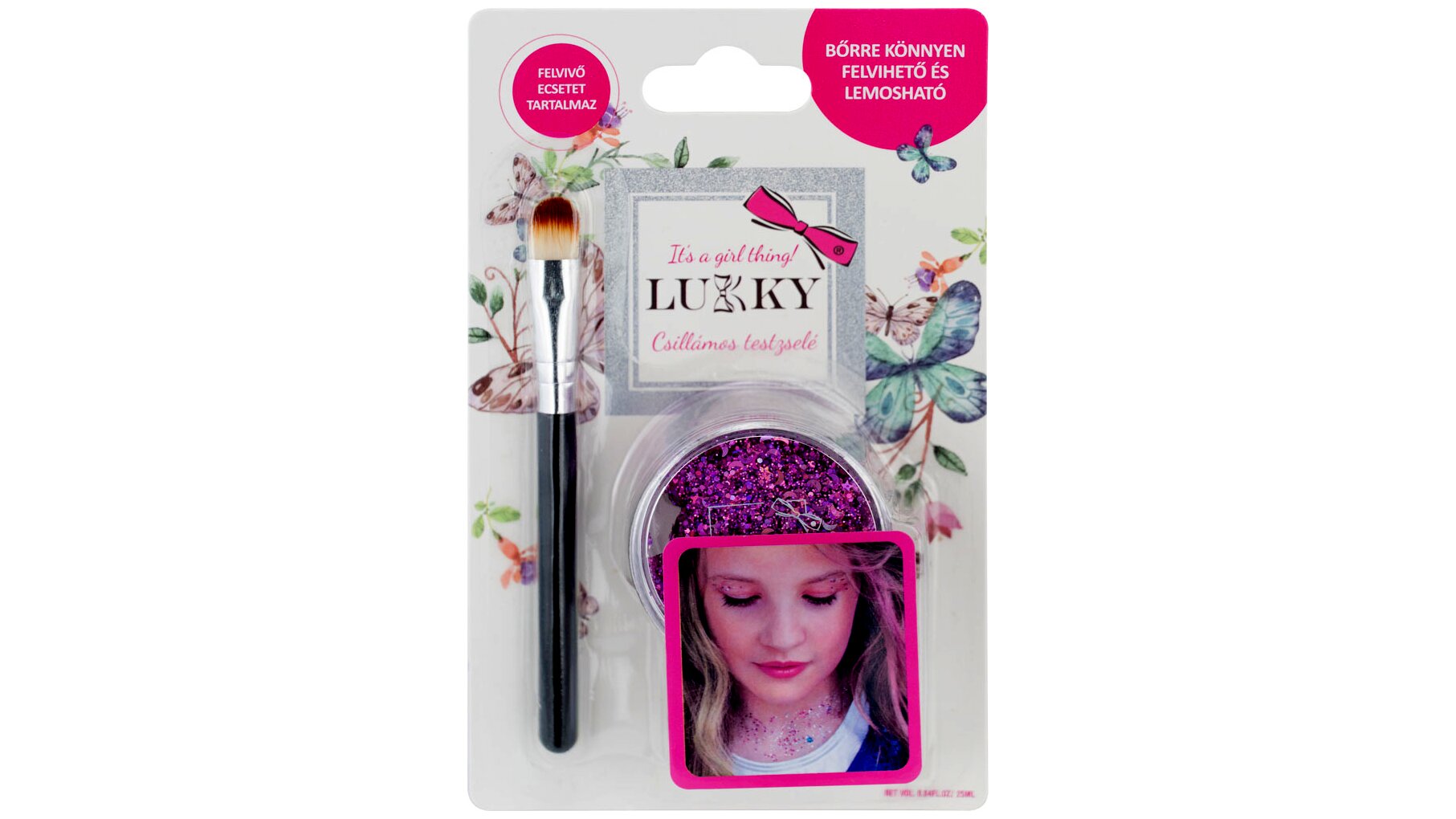 A Lukky csillámos testzselével a lányok egyszerűen és gyorsan varázsolhatnak maguknak csillámos bőrt. Használata könnyű, az ecset segítségével tudják a zselét felvinni a felületekre. Könnyedén lemosható.