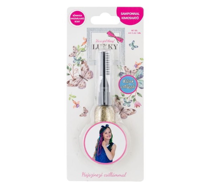 Tündöklő csillogás a hajon! A Lukky hajszínező csillámot biztonsággal próbálhatják ki a lányok, hiszen összetétele gyermekbarát és samponnal könnyedén kimosható a hajból. Használata is egyszerű: egy spirál segítségével fésülhető a hajszálakra. Legyen szó születésnapról, farsangról vagy bármilyen ünnepről a Lukky csillámmal garantált lesz a siker!