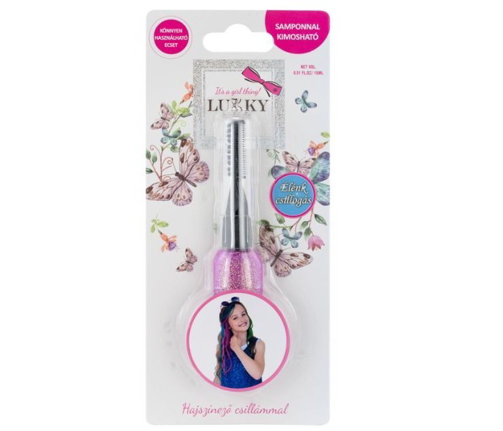 Tündöklő csillogás a hajon! A Lukky hajszínező csillámot biztonsággal próbálhatják ki a lányok, hiszen összetétele gyermekbarát és samponnal könnyedén kimosható a hajból. Használata is egyszerű: egy spirál segítségével fésülhető a hajszálakra. Legyen szó születésnapról, farsangról vagy bármilyen ünnepről a Lukky csillámmal garantált lesz a siker!
