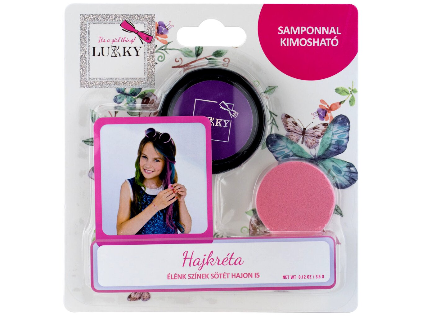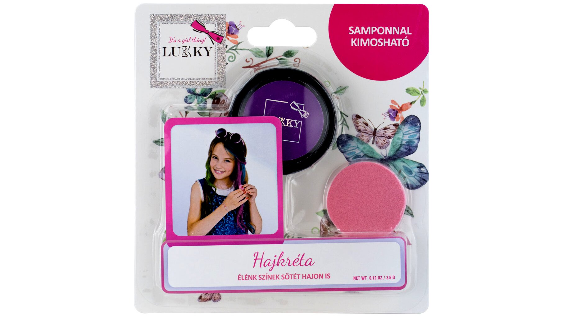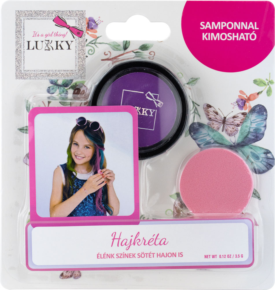 A Lukky hajkrétával egyszerűen és gyorsan varázsolhatnak maguknak a lányok színes hajtincseket. Ha extrém megjelenésre és vadító színekre vágynak a csajok, de idegenkednek a hajfestékektől ez a praktikus hajkréta tökéletes választás! Használata könnyű: csak végig kell húzni a választott hajtincseken. A szivacskorong a sötétebb színű hajat is befogja, samponnal pedig könnyedén lemosható.