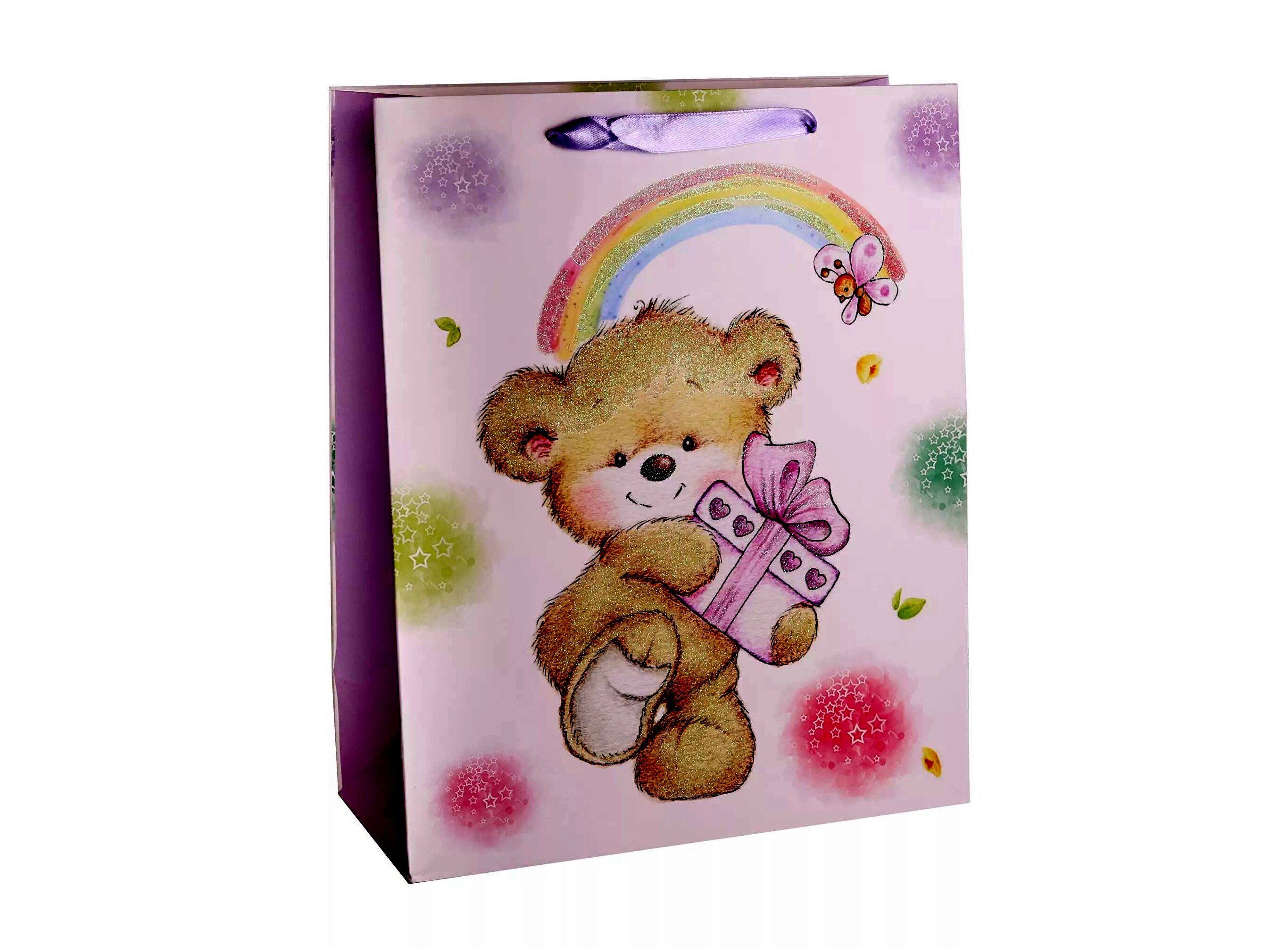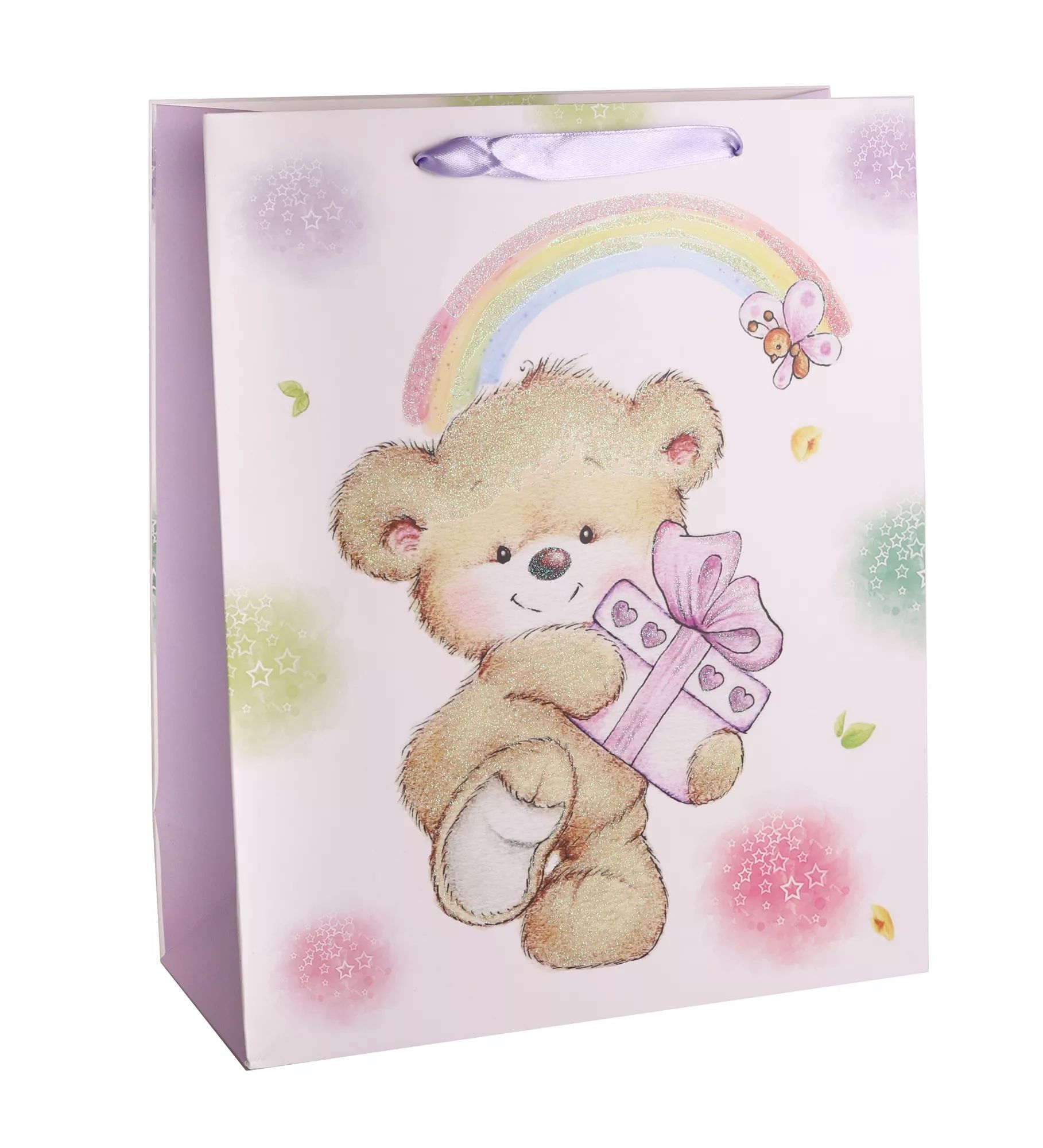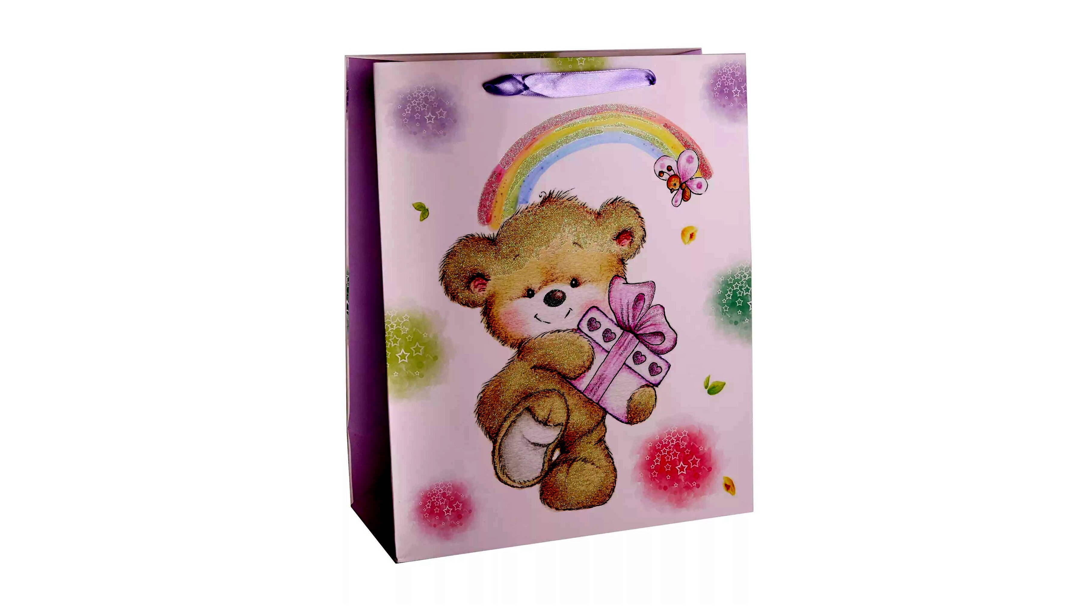 Ez a gyönyörű rózsaszín ajándéktasak, amelyen egy kedves maci látható, ajándékkal a mancsában, tökéletes választás a különleges ajándékokhoz. A glitteres kivitel és a szalagfülek eleganciát és varázst kölcsönöznek ennek a praktikus csomagolásnak.