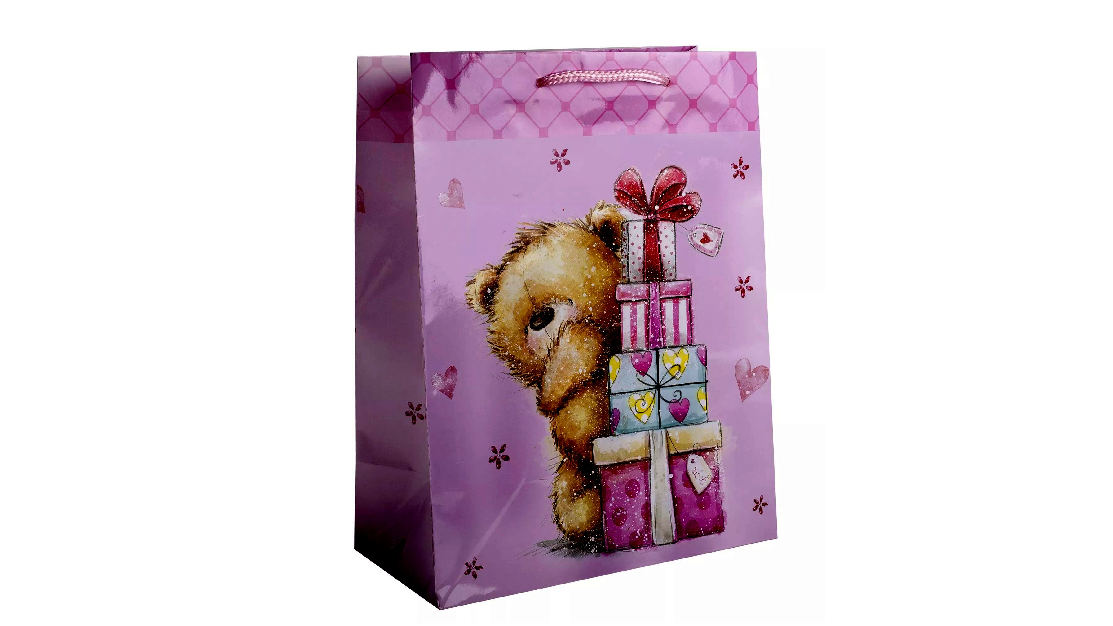 Varázsold különlegessé az ajándékozást ezzel az aranyos macit ábrázoló, rózsaszín/mintás ajándéktasakkal! Az ajándéktasak 26 x 32 cm-es mérete tökéletesen alkalmas kisebb-nagyobb meglepetések csomagolására, legyen szó születésnapról vagy bármilyen más ünnepi alkalomról. A szalagfüles kialakítás nemcsak praktikus és könnyen hordozhatóvá teszi, hanem elegáns megjelenést is kölcsönöz neki.