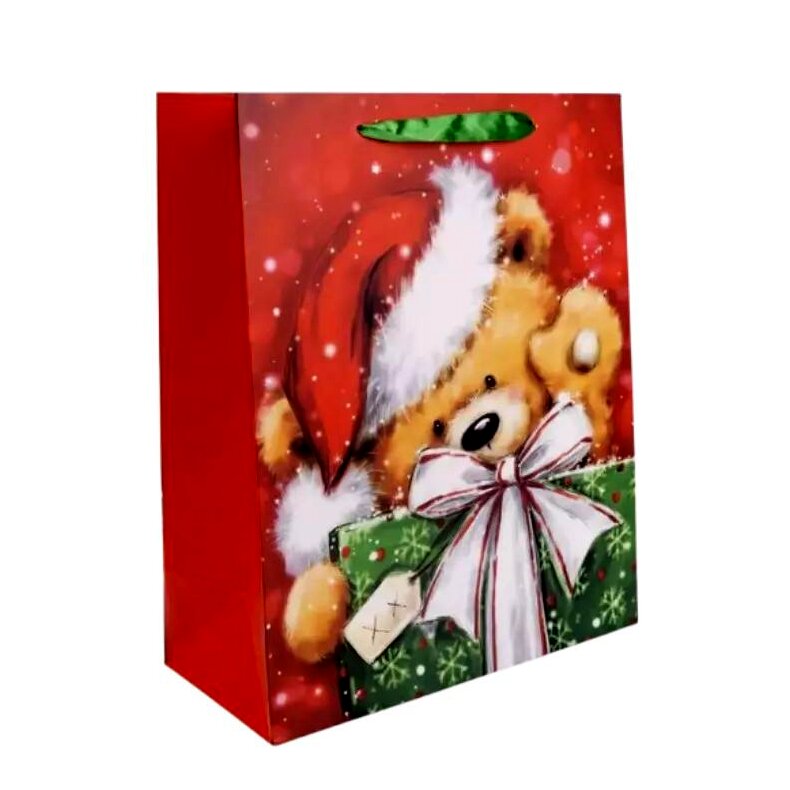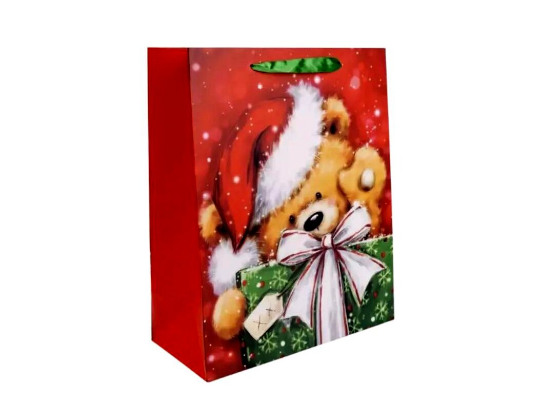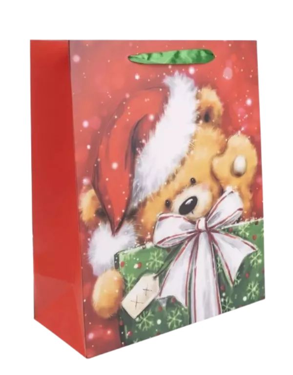 Lepje meg szeretteit ezzel a bájos és környezetbarát ajándéktasakkal, amely gyönyörű karácsonyi designnal rendelkezik! A maci mikulássapkában mintázat varázslatossá teszi az ünnepi hangulatot és mosolyt csal mindenkinek az arcára.