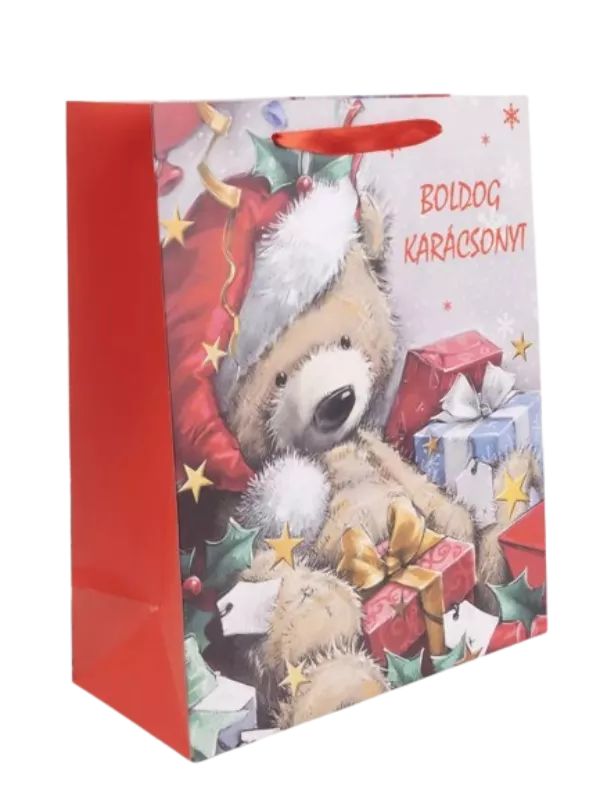 Ajándékozáskor szakítsd meg a szokásos unalmas csomagolási rutint ezzel a bájos karácsonyi ajándéktasakkal. A kedves macis motívum mosolyt csal mindenki arcára, és különleges hangulatot varázsol az ünnepi asztal köré. A 26 x 32 cm méretű tasak tökéletes választás kisebb és közepes méretű ajándékok stílusos átadására.