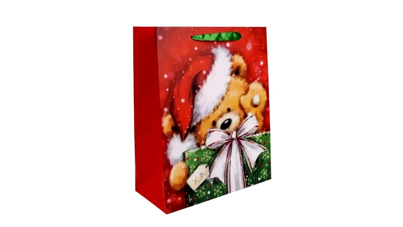 Ez a szalagfüles papír ajándéktasak tökéletes választás a karácsonyi ajándékok stílusos és praktikus csomagolásához. A cuki mikulássapkás maci design garantáltan mosolyt csal mindenki arcára, nem csak a gyerekekéire!