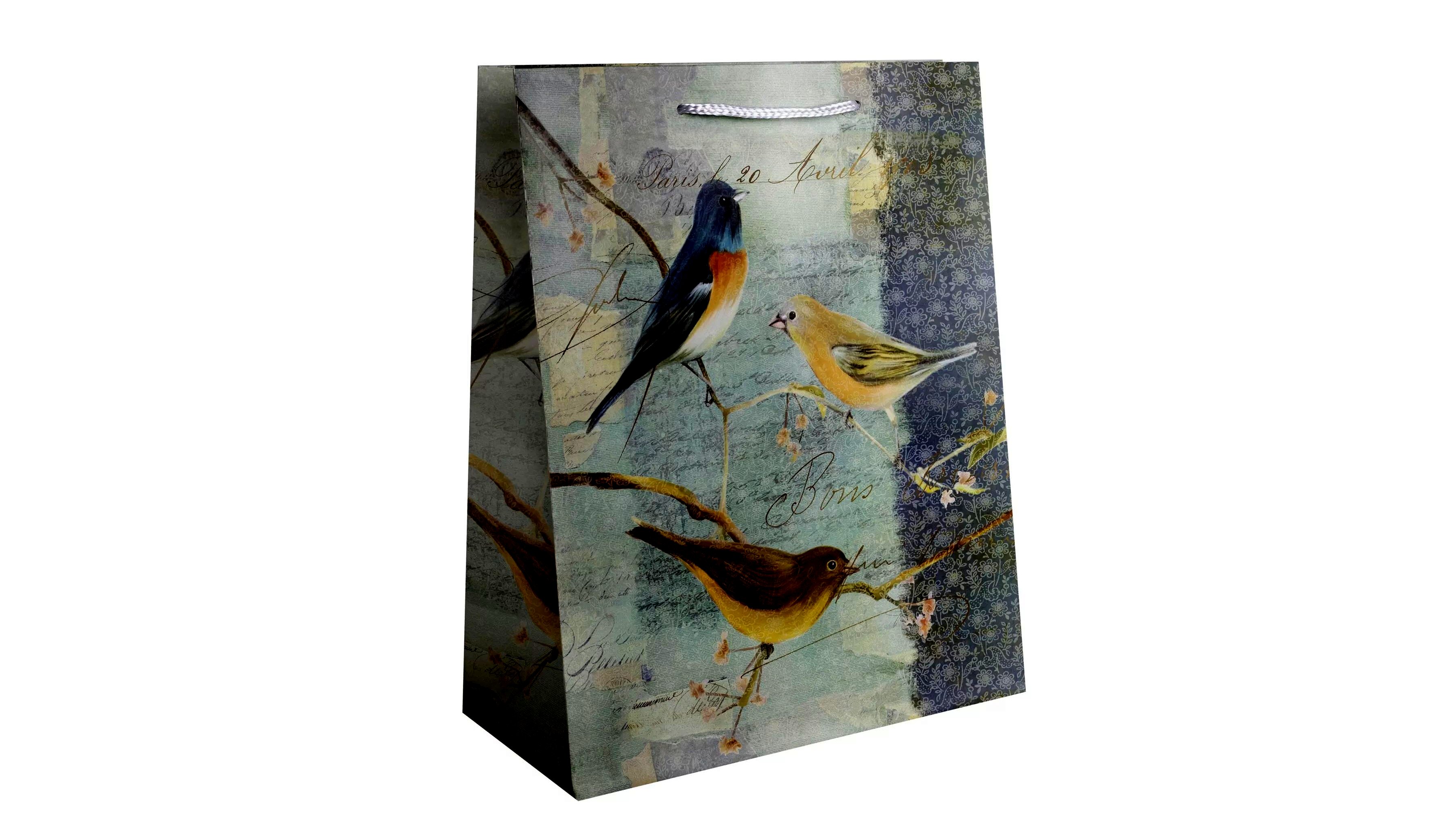 Készülj stílusosan minden különleges alkalomra ezzel a gyönyörű, madarakat ábrázoló ajándékzacskóval! A szalagfüles kialakítás révén nem csak praktikus, de könnyedén hordozható megoldást nyújt. Ez az ajándéktasak nemcsak esztétikailag vonzó, hanem környezetbarát is, hiszen többször felhasználható, így csökkenti a hulladék mennyiségét a hagyományos csomagolópapírral szemben.