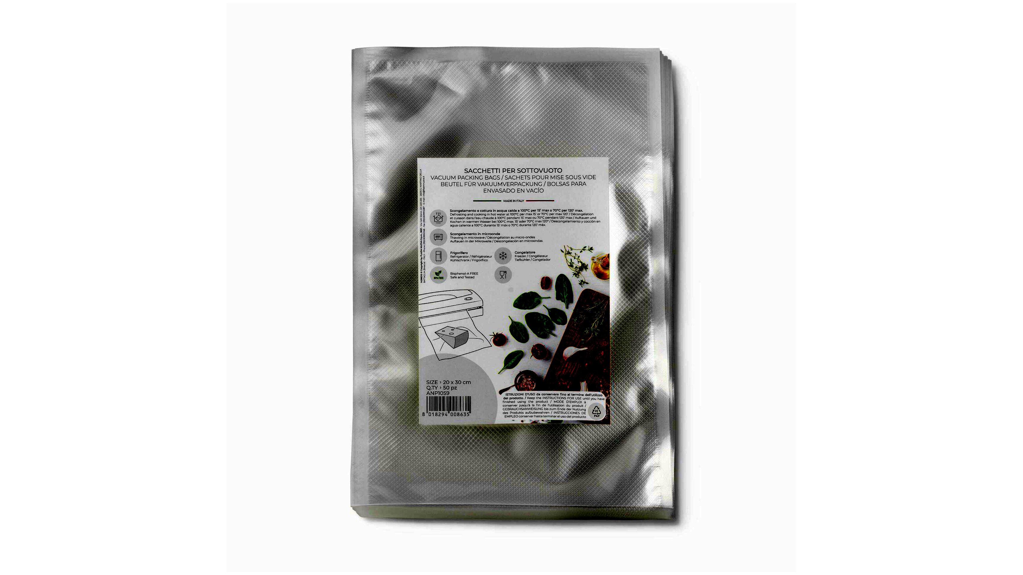 A MagicVac ANP1059 vákuum csomagoló fólia tökéletes választás mind a háztartások, mind a professzionális konyhák számára. Az 50 db-os csomagban kapható fóliák mérete 20 x 30 cm, amely optimális méretet biztosít különféle élelmiszerek tárolásához és frissességük megőrzéséhez.