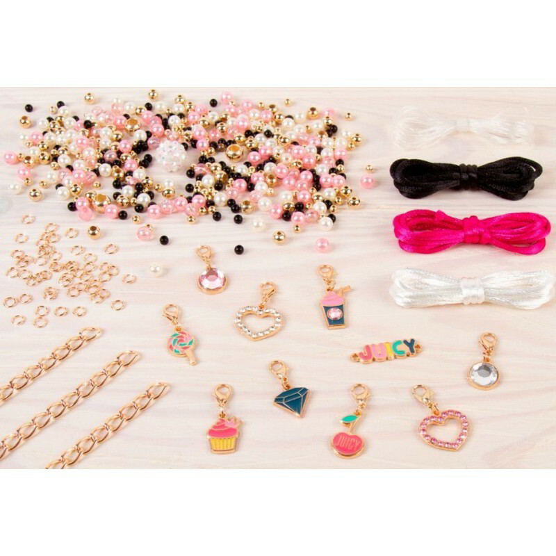 A Make it Real Juicy Couture Pink és csillogó ékszerkészítő készletével a kislányok igazán csillogó kiegészítőket alkothatnak maguknak vagy barátnőiknek. A csomagban található aranyszínű láncokból, stílusos medálokból és a 390 darab különféle, összepasszoló gyöngyből elegáns, minden kor divatjához alkalmazkodni képes karkötők készíthetők. A készlet a gyöngyök mellett szatén- és áttetsző zsinórokat, láncokat is tartalmaz, így összesen 10 csillogó karkötő készíthető el. Az elkészült ékszerekkel garantáltan a suli sztárjai lesznek a büszke alkotók.