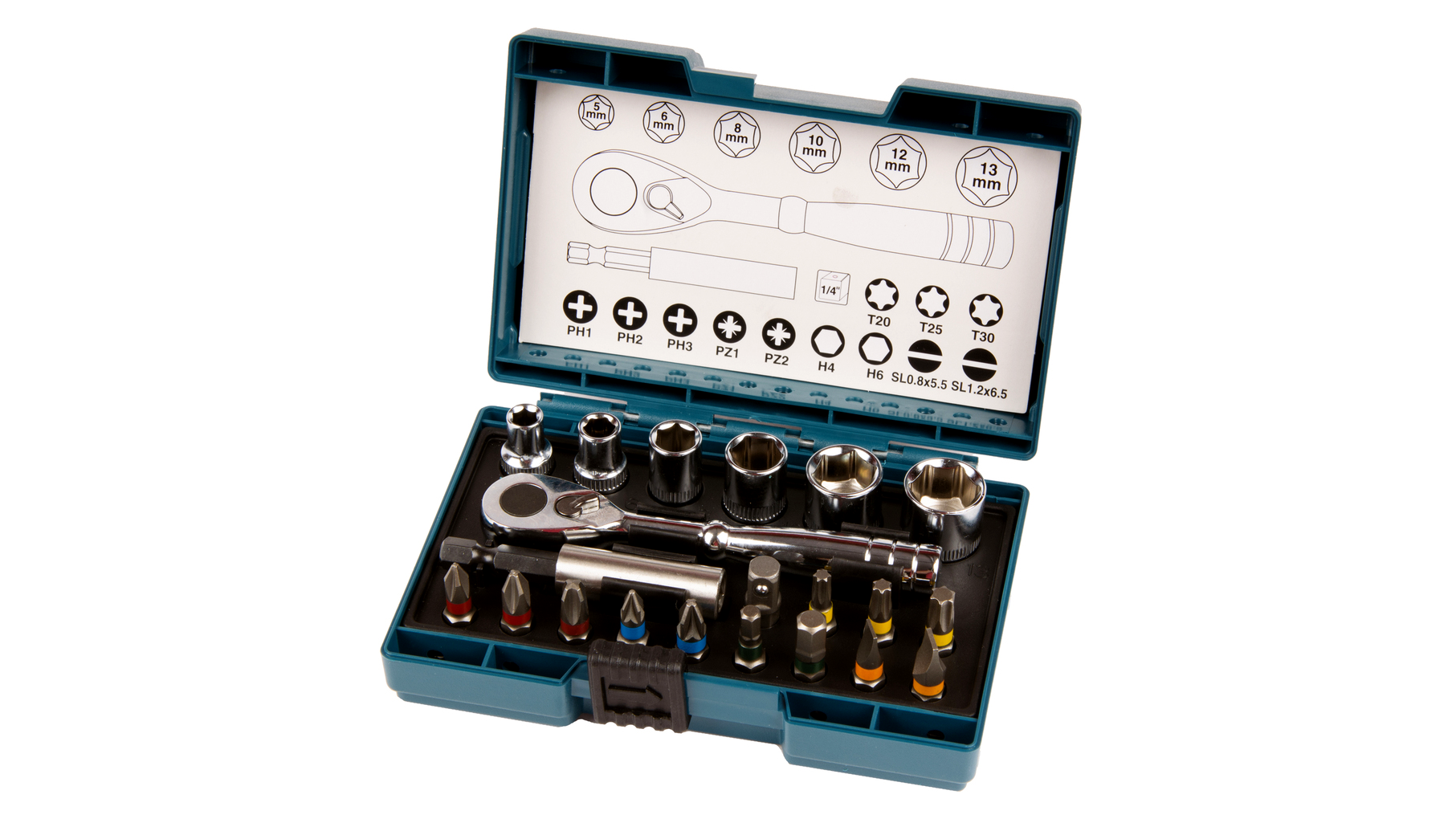 A készlet tartalma: 1x racsnis kulcs, 1x anya egyenként 5, 6, 8, 10, 12, 13 mm-es, 1x 1/4"-os csatlakozás, bitek egyenként 1x PH 1, 2, 3, PZ 1, 2, H 4, 6 SL 0,8 x5 .5, 1.2x6.5, T 20, 25, 30 és 1x mágneses bittartó
