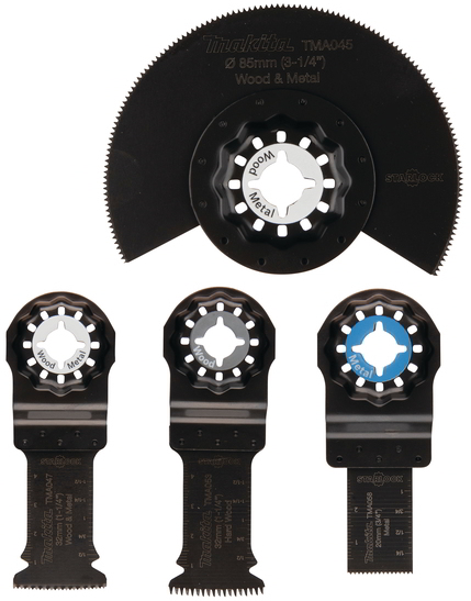 A B-67480 Makita Diving Blade szett három merülőfűrészlapot és egy tömbfűrészlapot tartalmaz többfunkciós szerszámokhoz.