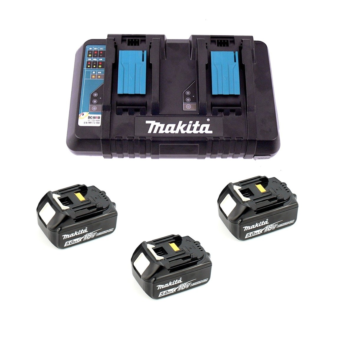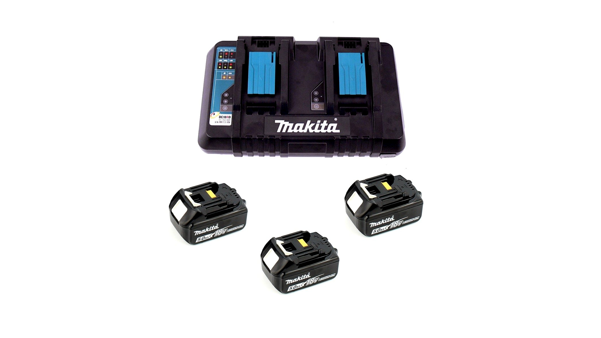 Készlet, amely a következőkből áll: 3 x BL1850B 5,0 Ah újratölthető akkumulátor, 1 x DC18RD gyors töltő. Ideális energiaforrás a solo modellekhez.
