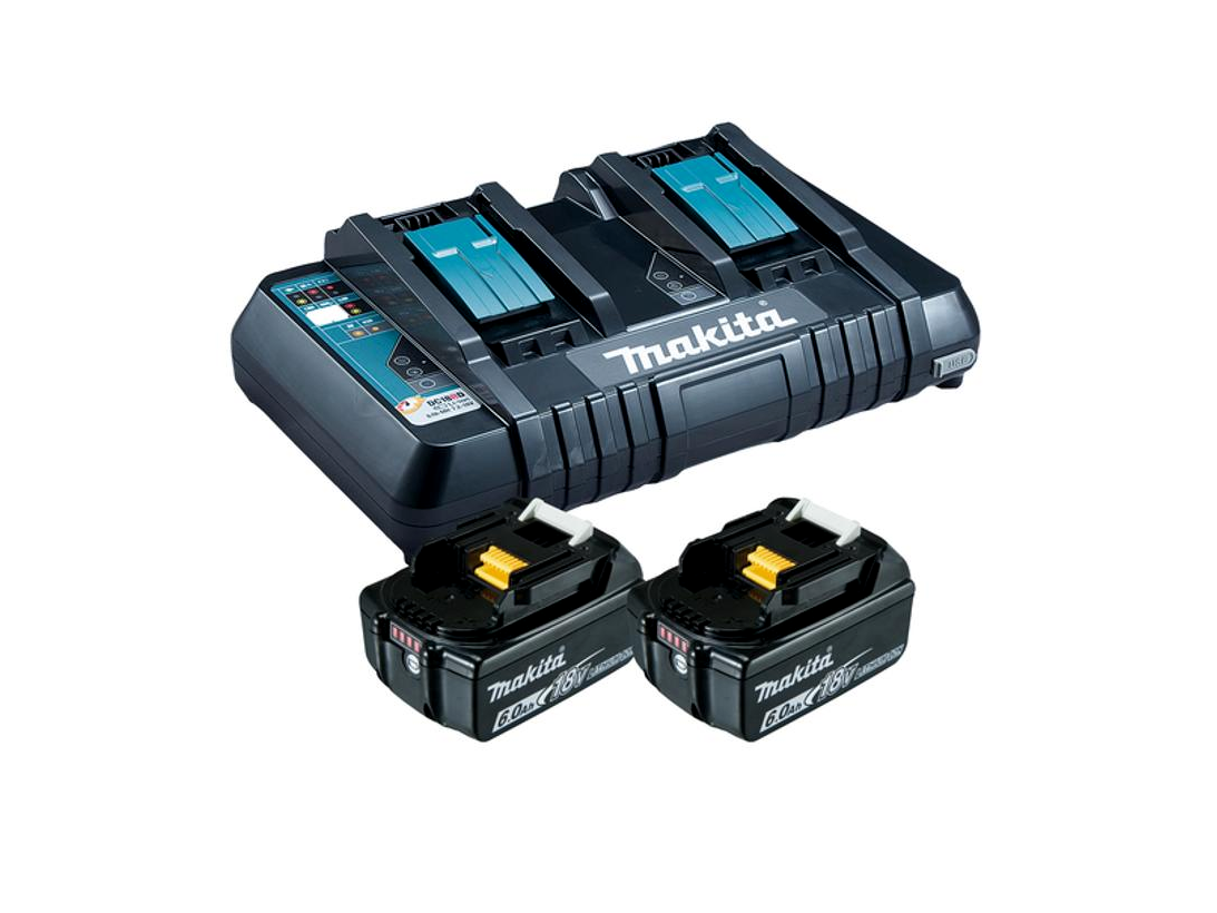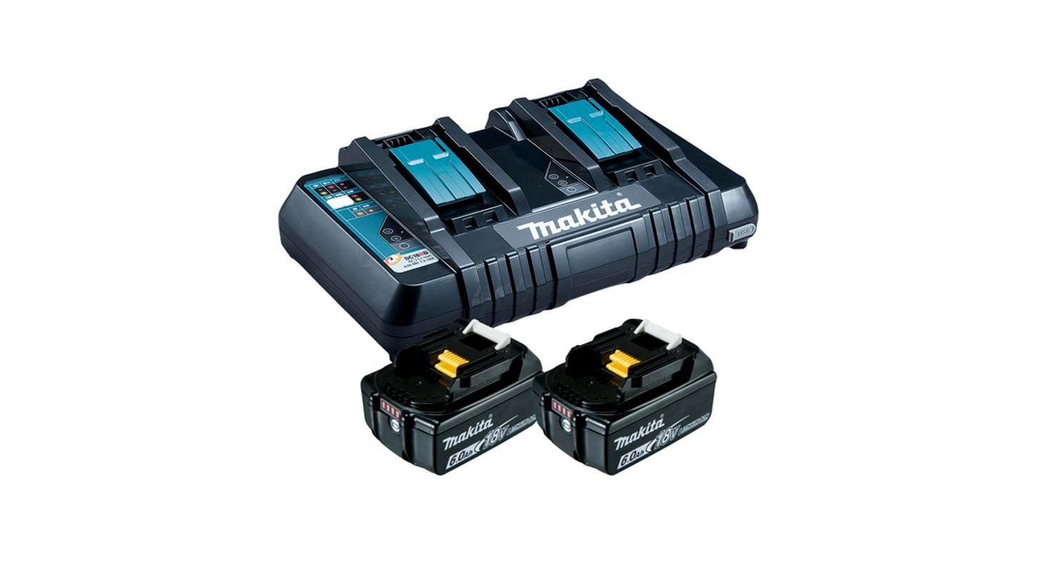 Készlet, amely a következőkből áll: 2 x BL1860B 6.0 Ah újratölthető akkumulátorok, 1 x DC18RD gyors töltő. Ideális energiaforrás a solo modellekhez.