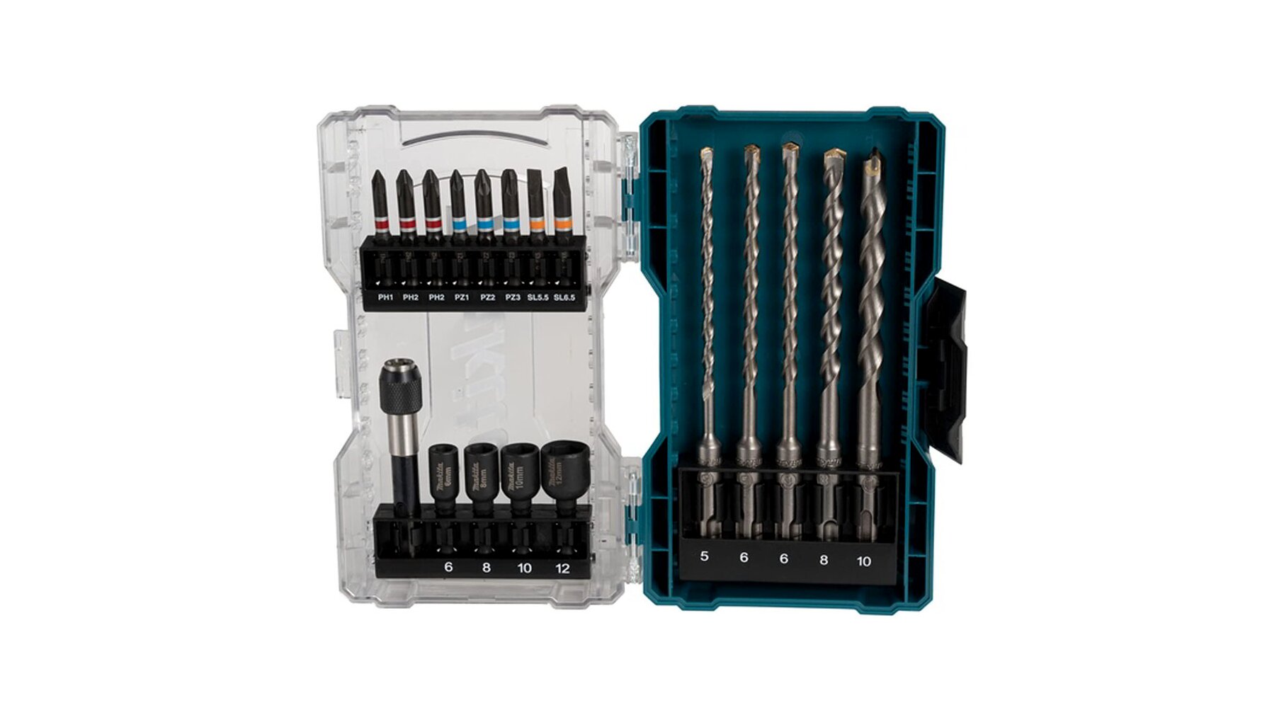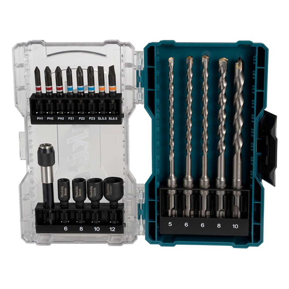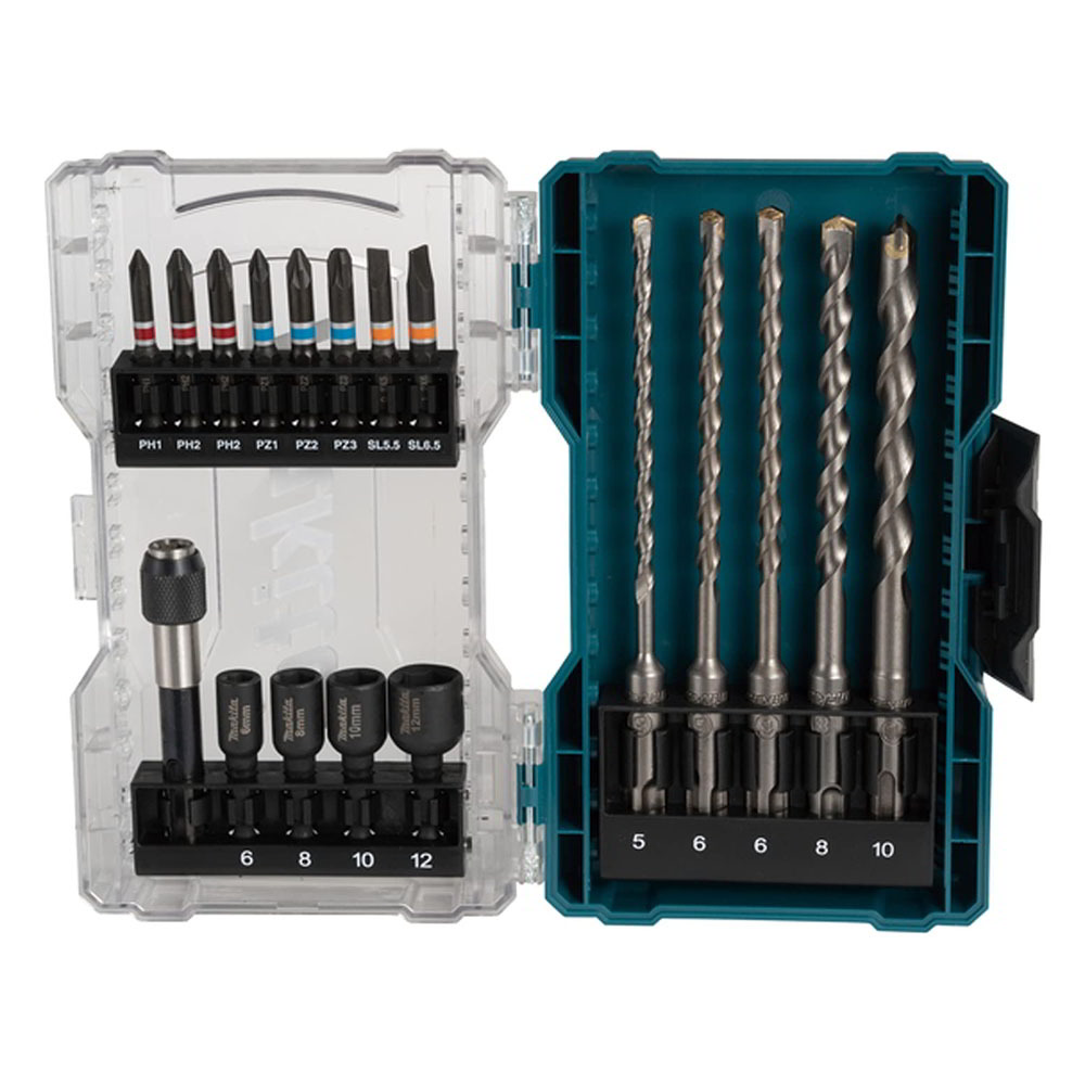 18 darabos fúró- és csavarhegy készlet átlátszó műanyag tokban, amely megkönnyíti a felhasználó számára a tartalom felismerését. Ideális falazáshoz. Tartalmazza: (PH1, PH2 x 2, PZ1, PZ2, PZ3, SL0.8x5.5, SL1.2x6.5), 4 x anyavető (6, 8, 10 és 12 mm), 5 x SDS-PLUS fúrószár (5, 6 x 2, 8 és 10 mm) és egy mágneses bitgyorstartó (80 mm hosszú).