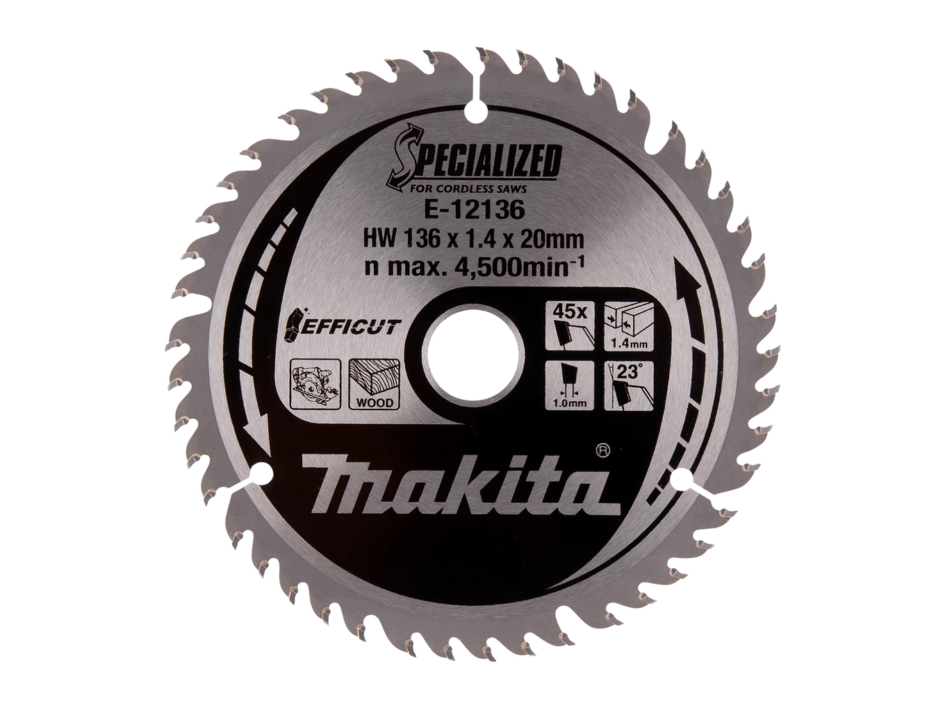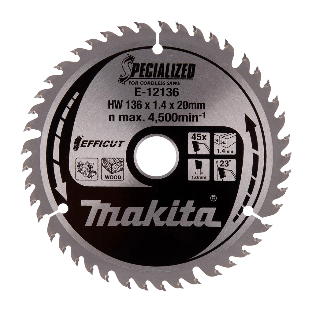 Az EFFICUT körfűrésztárcsával könnyedén és gyorsan vághatjuk a fa anyagokat. Ezt az 136 mm átmérőjű, 45 fogú keményfém hegyekkel ellátott fűrésztárcsát kifejezetten akkumulátoros körfűrészekhez fejlesztették ki, hogy maximális hatékonyságot és teljesítményt biztosítson.