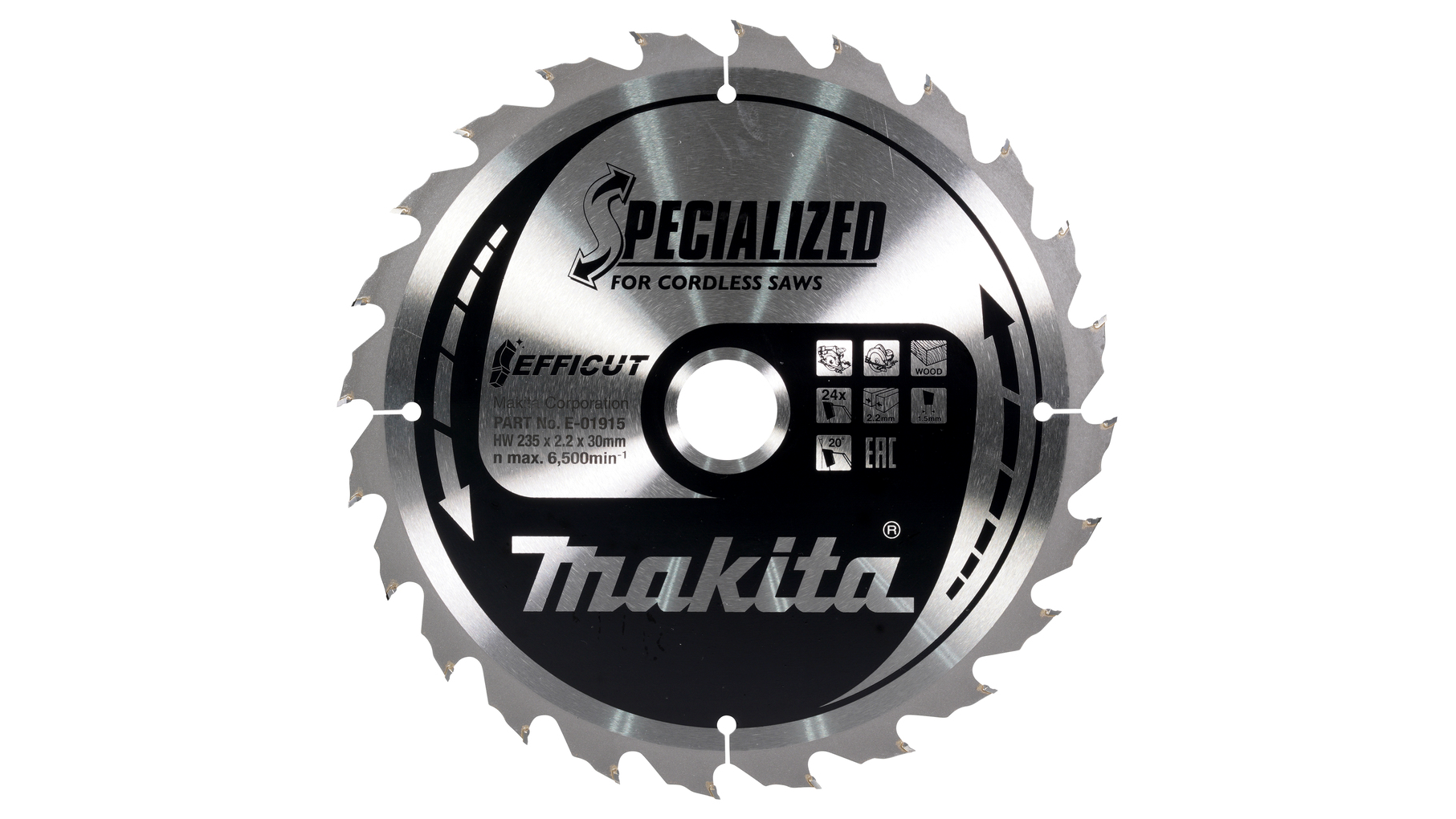 Fedezze fel a Makita EFFICUT fa körfűrészlapot, melyet kifejezetten az akkumulátoros körfűrészek hatékony használatához fejlesztettek ki. A 235 mm átmérőjű tárcsa 30 mm-es furattal és 24 precíz kialakítású foggal rendelkezik, melyek 2,2 mm-es vágási hézaggal biztosítják a gyors és tiszta vágásokat.