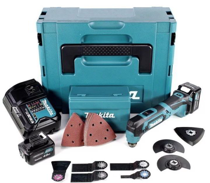 MAKPAC 2-es méret, 2x újratölthető akkumulátor BL1040B Li (10,8Volt 4,0Ah), töltő DC10SA 10,8V, C adapter, delta csiszolópapír K60 LL, delta csiszolópapír K100 LL, delta csiszolópapír K150, Szegmensfűrészlap 85mm TMA006, szegmensfűrészlap 85mm TMA007, 28 mm-es merülőfűrészlap TMA009, 32 mm-es TMA010 fűrészlap, 32 mm-es merülőfűrészlap TMA012, Scraper 52 HCS Flex. TMA019, 6-KT csavarkulcs 5mm