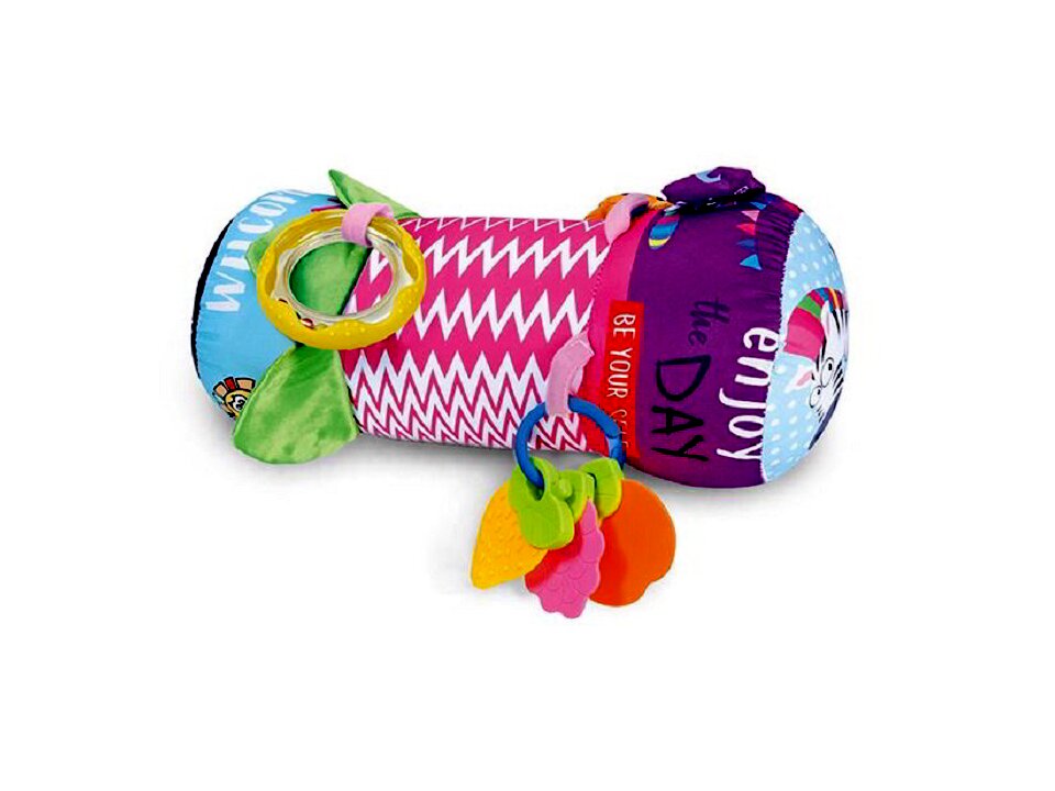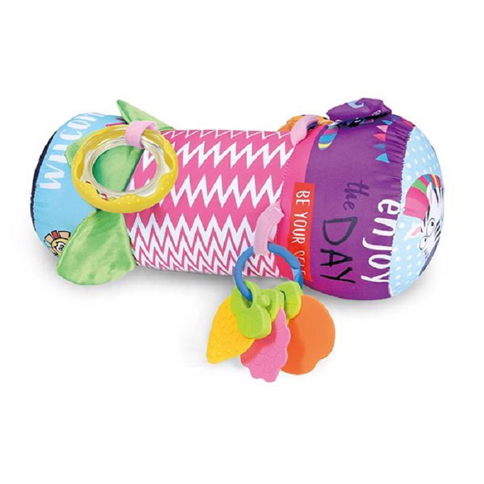 A színes foglalkoztató párna különlegessége az, hogy különféle textúrák kombinálásával fejleszti a babák érzékszerveit. A tapintás, látás és hallás egyaránt stimulált lesz a párnán található ropogós, sziszegő és csilingelő elemek által. Emellett a puha játékfigura, amely a párna része, külön leköti a babákat és meghosszabbítja az interaktív játékidőt.