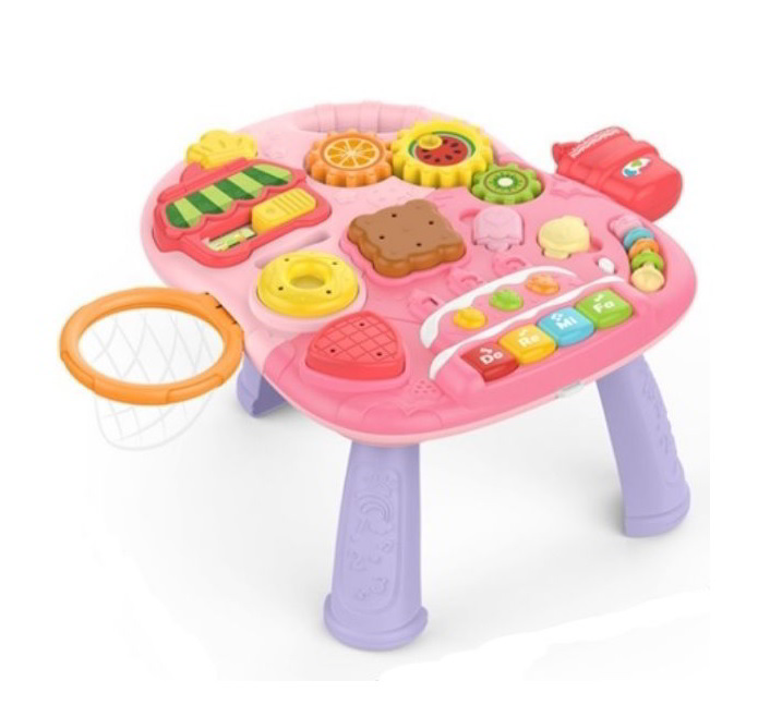A foglalkoztató asztal számos lehetőséget kínál a kicsik számára, hogy különböző készségeiket fejlesszék. A gyerekek élvezettel dobhatják a golyókat a kosárba, zenét komponálhatnak 4 különböző hangból, és felfedezhetik a formaválogató játékot és forgatható fogaskerekeket. Az asztal ergonomikusan kialakított fogantyúval rendelkezik, így bármikor könnyedén áthelyezhető, hogy mindig ott legyen, ahol a játék folyik.