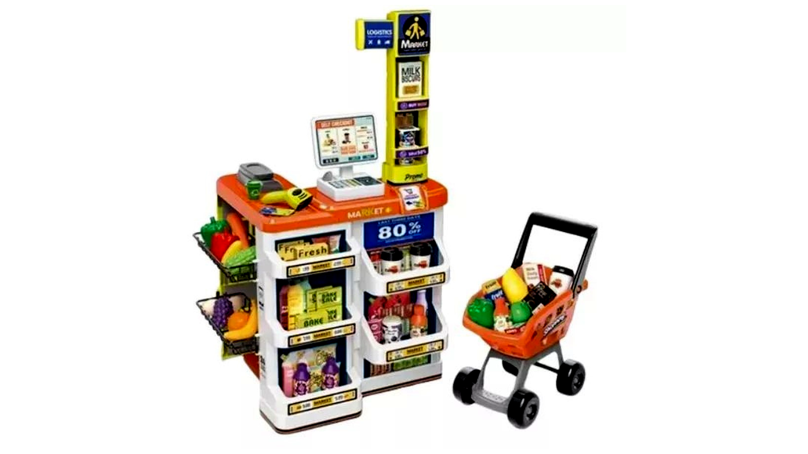 - 🛒 Teljes szupermarket állvány pénztárgéppel, vonalkódleolvasóval és polcokkal