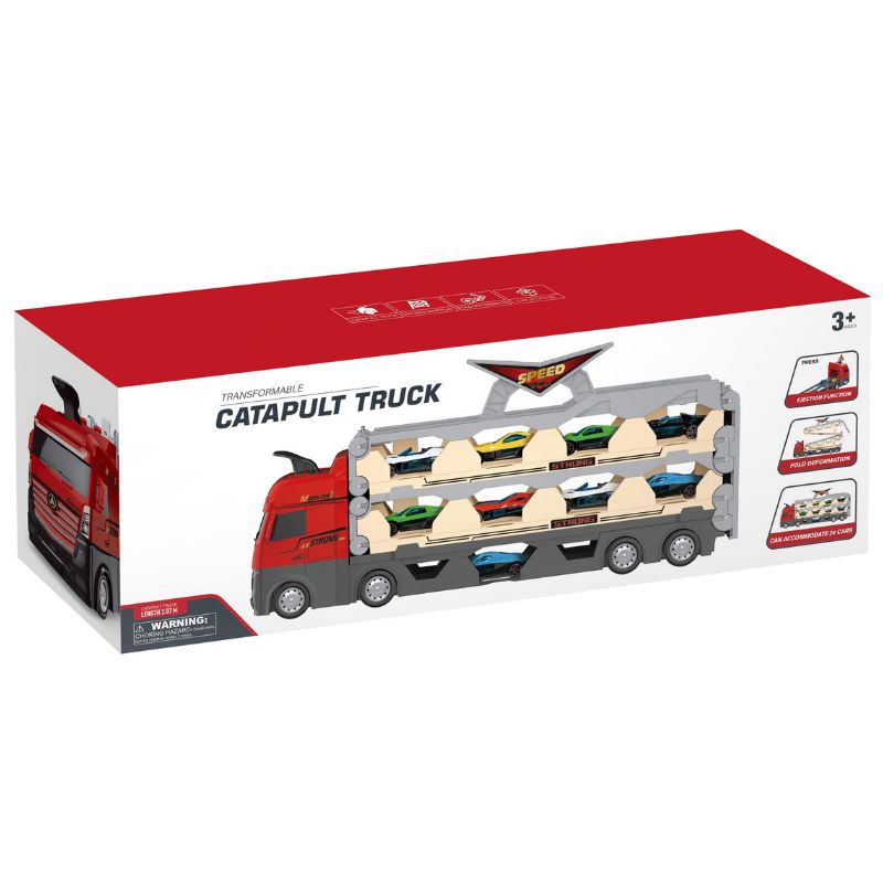 - Kihajtható versenypálya: A kamion oldala kihajtható, így azonnal versenypályává alakítható, amely még izgalmasabbá teszi a játékot.