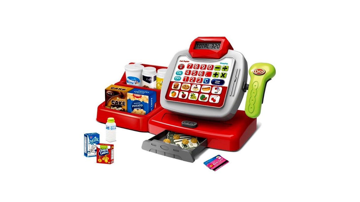 A pénztárgép egy valósághű pénztáros élményt biztosít a gyermekek számára, hiszen a pénztárgép tartalmazza a legfontosabb funkciókat: számológépet, csipogó szkennert és nyitható pénzfiokot. Az állványos kialakítás segít az élelmiszerek elrendezésében, így a kicsik komplett üzletet játszhatnak el. A készletben található továbbá készpénz és bankkártya, amely még valósághűbbé teszi a játékot.