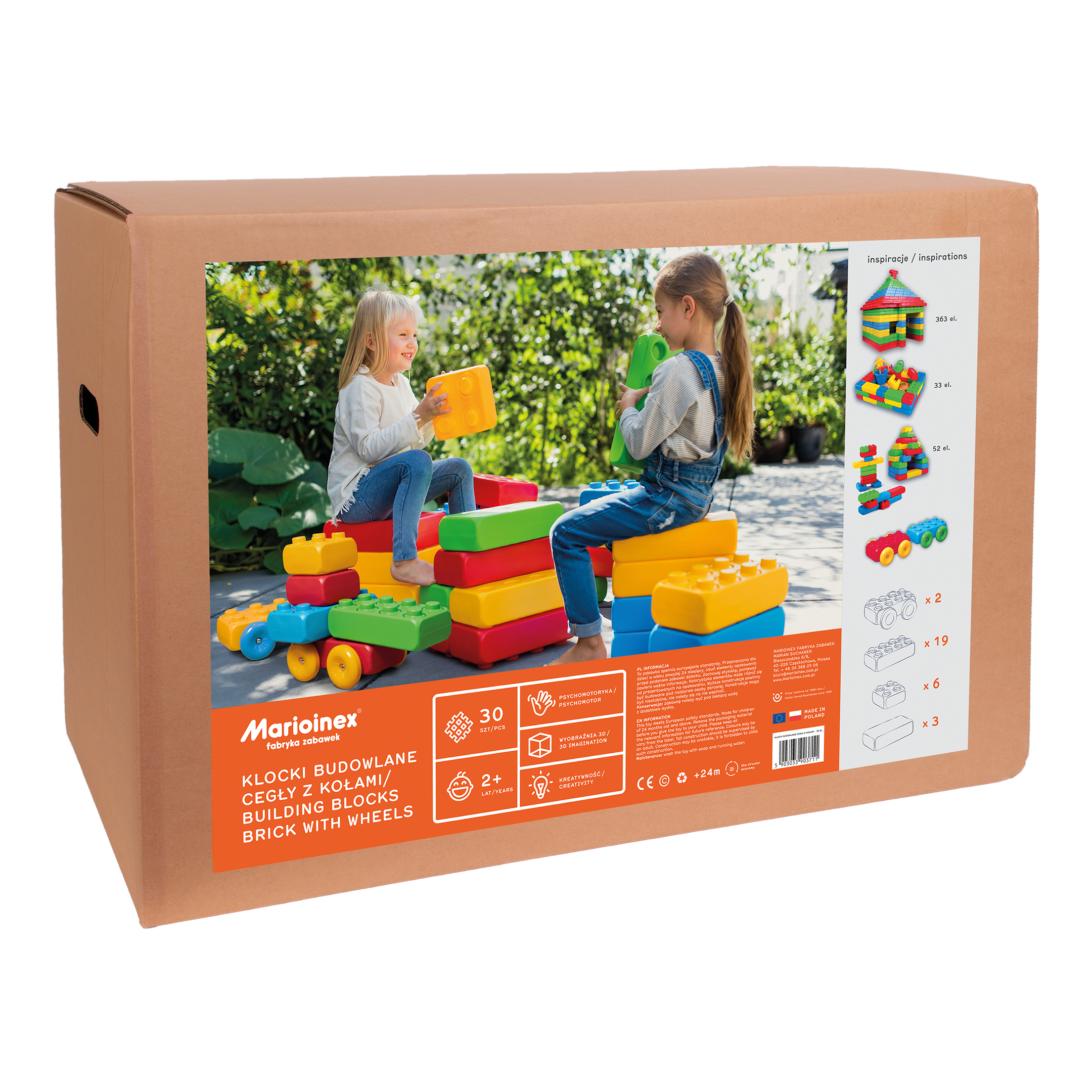 Az óriási elemekkel a gyerekek szó szerint „bemászhatnak” az építményeik közé: készíthetnek házikót, alagutat, magas tornyot, téglafalat vagy saját tervezésű járművet. A készletben található 2 keréknek köszönhetően könnyedén alkothatnak autót, buszt vagy bármilyen guruló járművet is.
