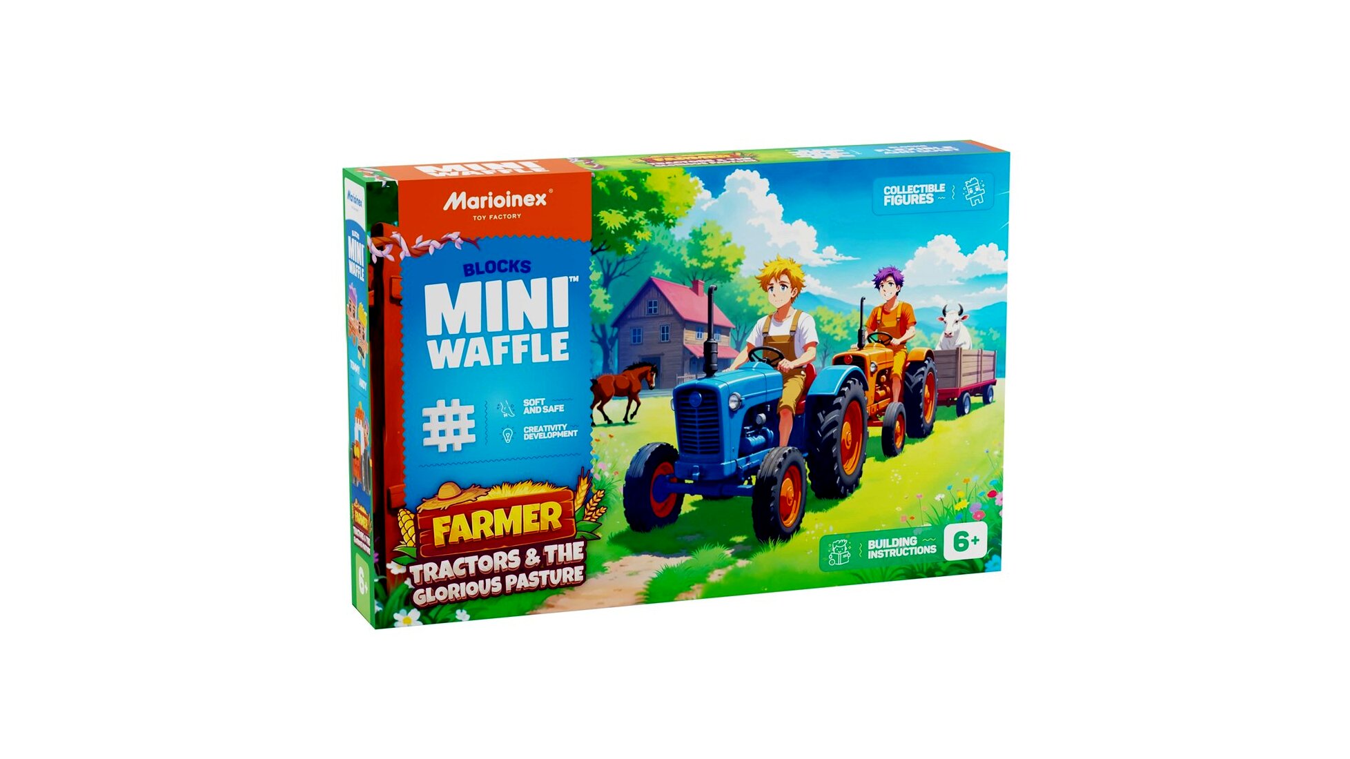 A 110 darabos szettben minden benne van, ami egy izgalmas, falusi történethez kell. A gyerekek két traktort építhetnek meg, kialakíthatják a „wypasiona łąka” – azaz szuper legelő – területét, felépíthetik a fát, és elhelyezhetik az állatfigurákat, akikre Tommy és Andy, a két farmerfigura gondoskodóan vigyáznak. A rugalmas, egymásba illeszthető Mini Waffle elemekkel könnyen alakíthatók újabb és újabb járművek, építmények, kerítések vagy fantáziavilágok, így a játék minden alkalommal más és más történetet mesél el.