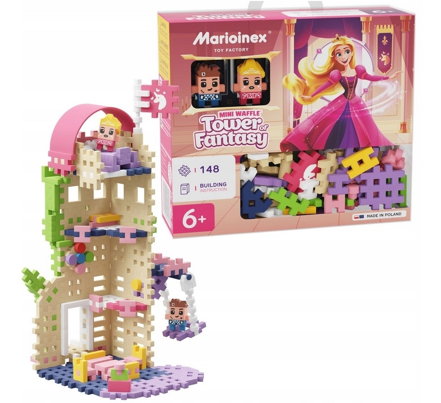 A Marionex Waffle Mini - Princess Tower készlet 148 darabja lehetőséget nyújt a kicsiknek, hogy fantáziájukat szabadjára engedve saját mesebeli világot teremtsenek. A hercegnő torony három kamrája ideális helyszínt biztosít izgalmas szerepjátékokhoz, ahol Izabella hercegnő és Cedric lovag felejthetetlen kalandokat élhet át.