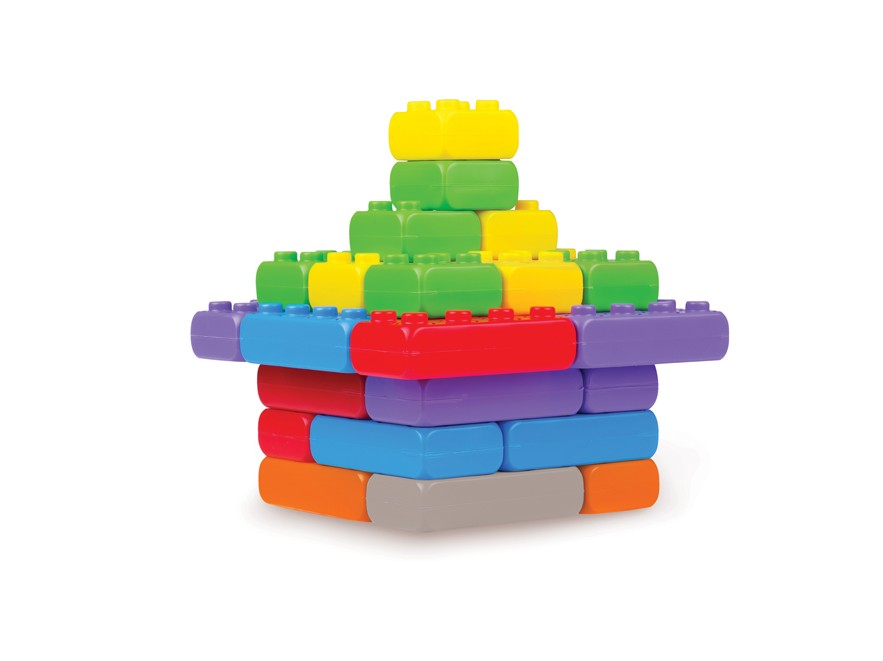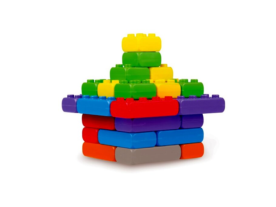 Junior 60 elemből álló színes, műanyag építőelemkészlet. Csomagolása fólia. Az egész kocka mérete: 11,5 x 5,7 x 3,5 cm, fél kocka mérete: 5,7 x 5,7 x 3,5 cm.