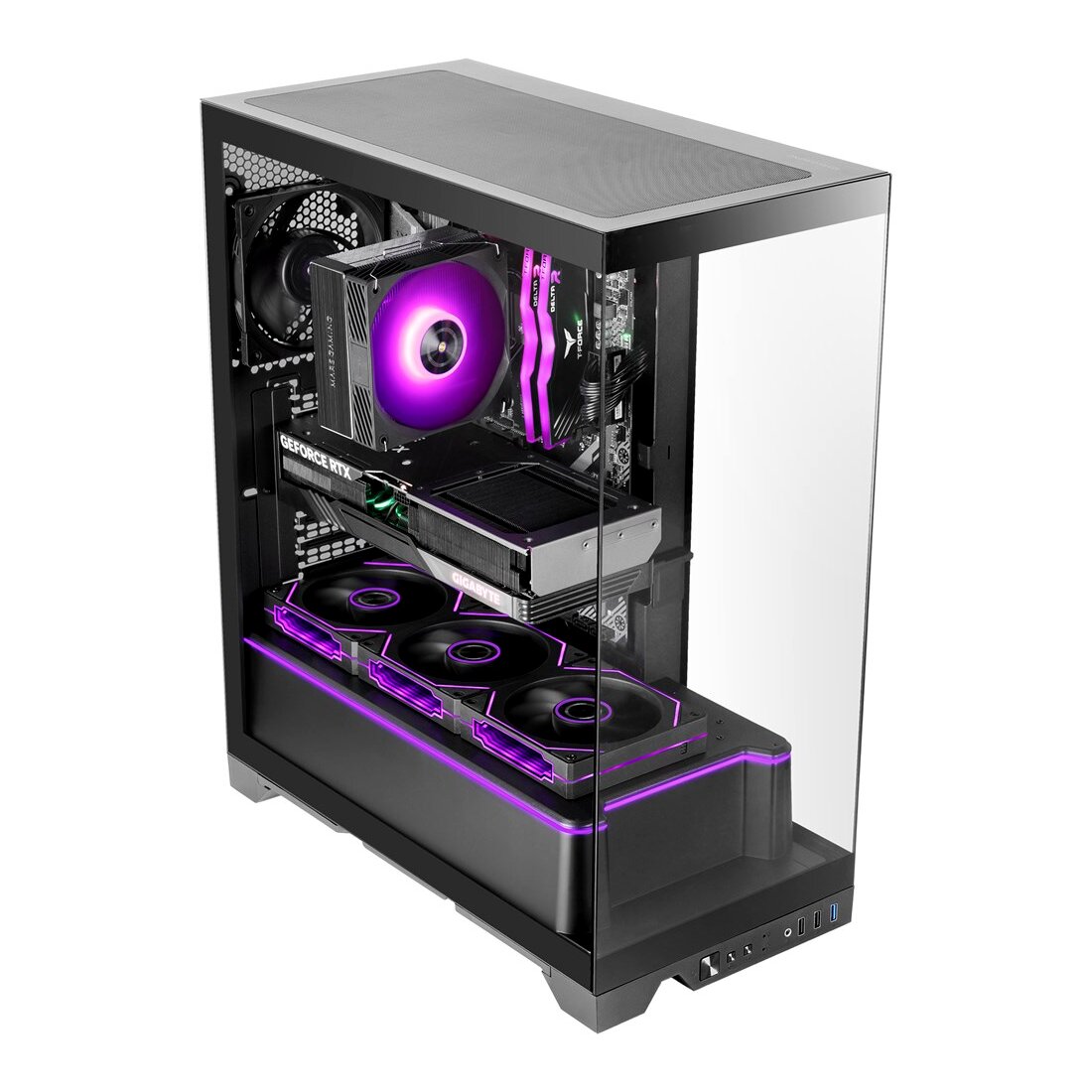 A beépített ARGB LED szalag gondoskodik arról, hogy a konfiguráció ne csak erős, hanem látványos is legyen. A megfelelő ARGB vezérlővel vagy kompatibilis alaplappal szinkronizálhatók a fényhatások az egyéb RGB komponensekkel, így egységes, személyre szabott megjelenést hozhatsz létre. Az üvegpanel(ek) és a duál kamrás elrendezés különösen jól kiemeli a videokártyát, hűtést és kábelezést.