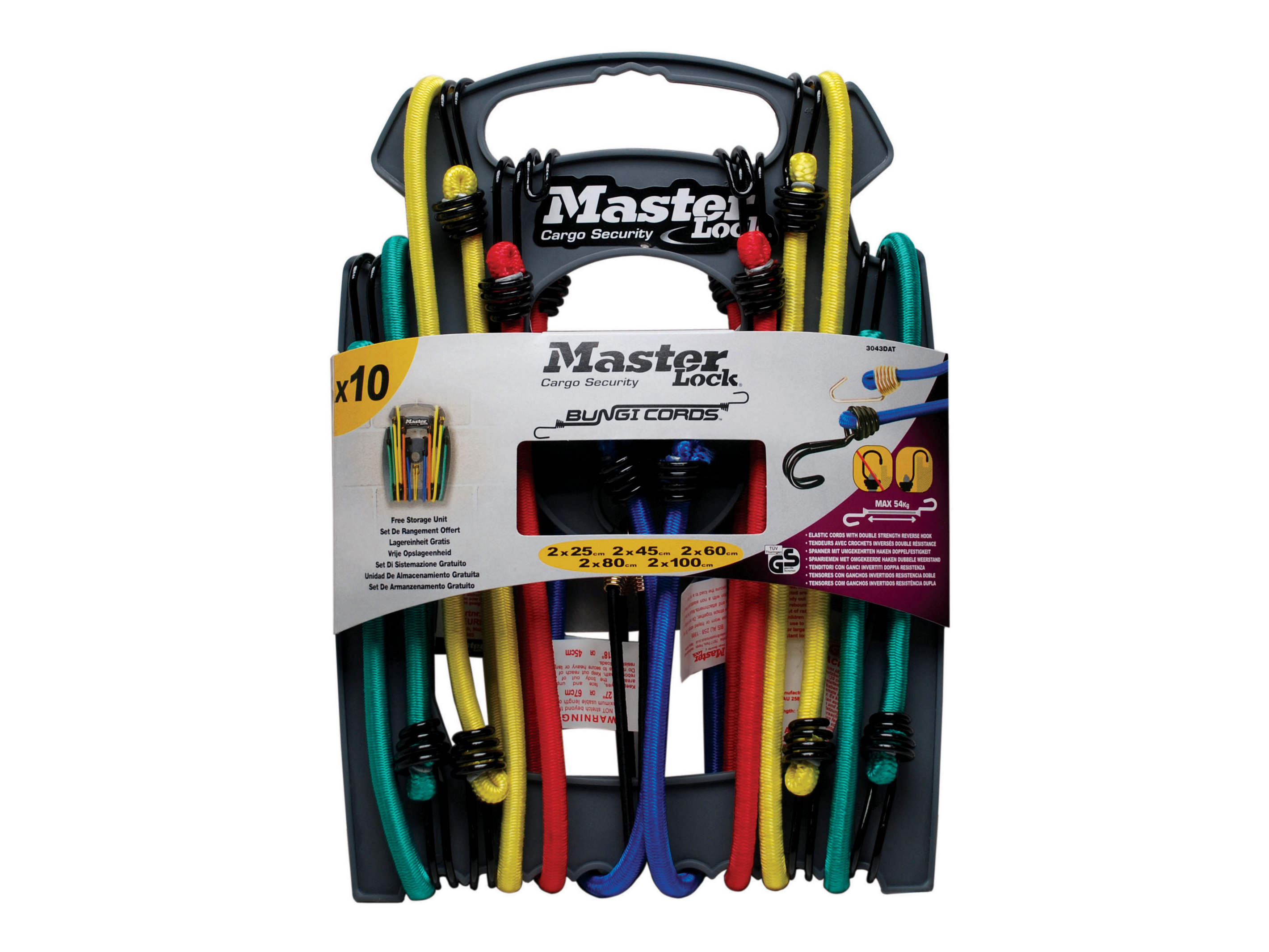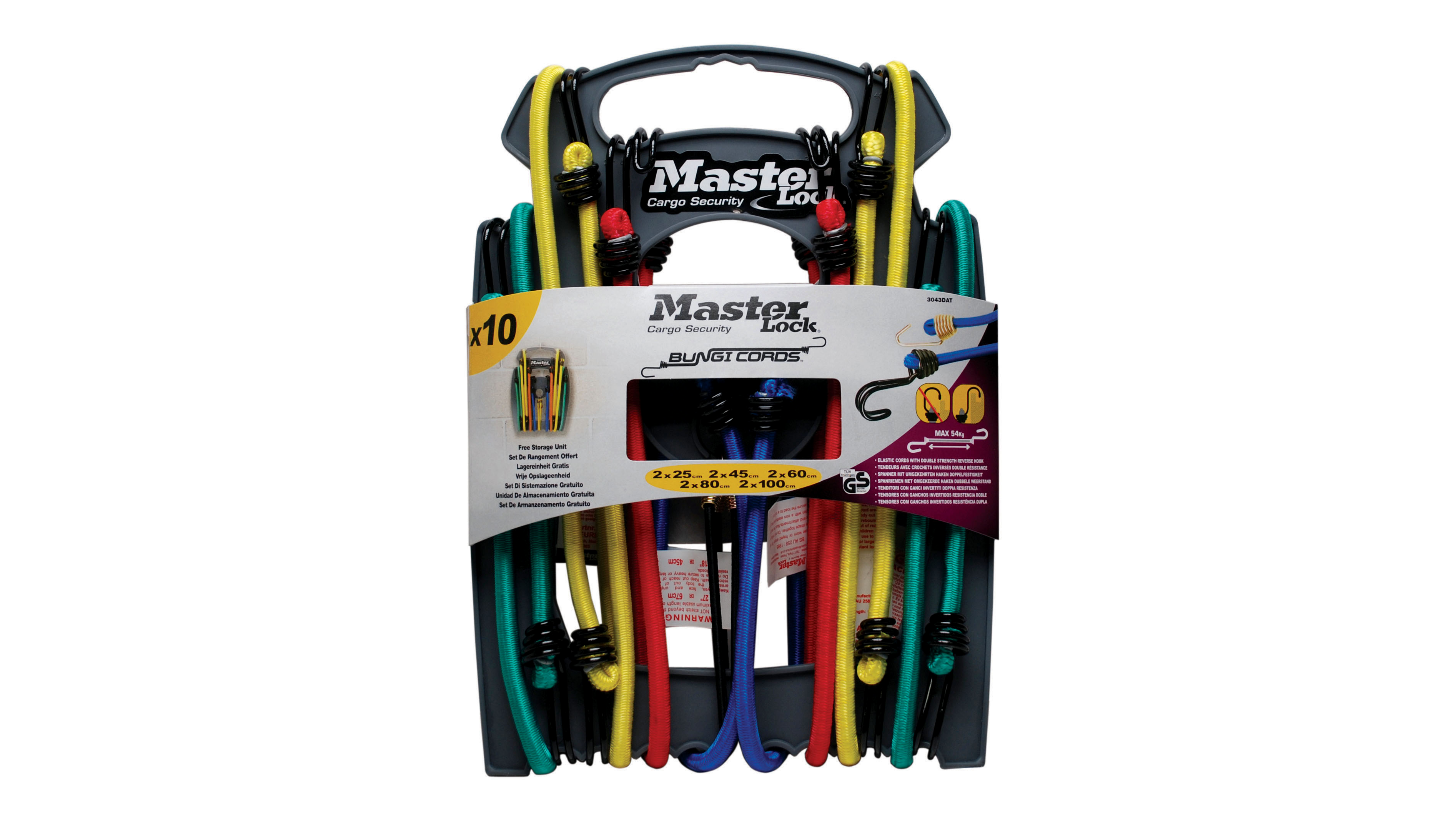 A Master Lock Twin Wire™ No. 3043EURDAT számos praktikus tulajdonsággal bír, beleértve a 10 darabból álló gumipók sort, amelyek drót kampókkal további erősséget biztosítanak. A fordított kampó kialakítása extra helyet ad a rögzítéshez, míg a lekerekített kampók csökkentik a karcolás veszélyét. A kényelmes tárolást, szervezést és szállítást szolgáló keret beépített fogantyúval rendelkezik.