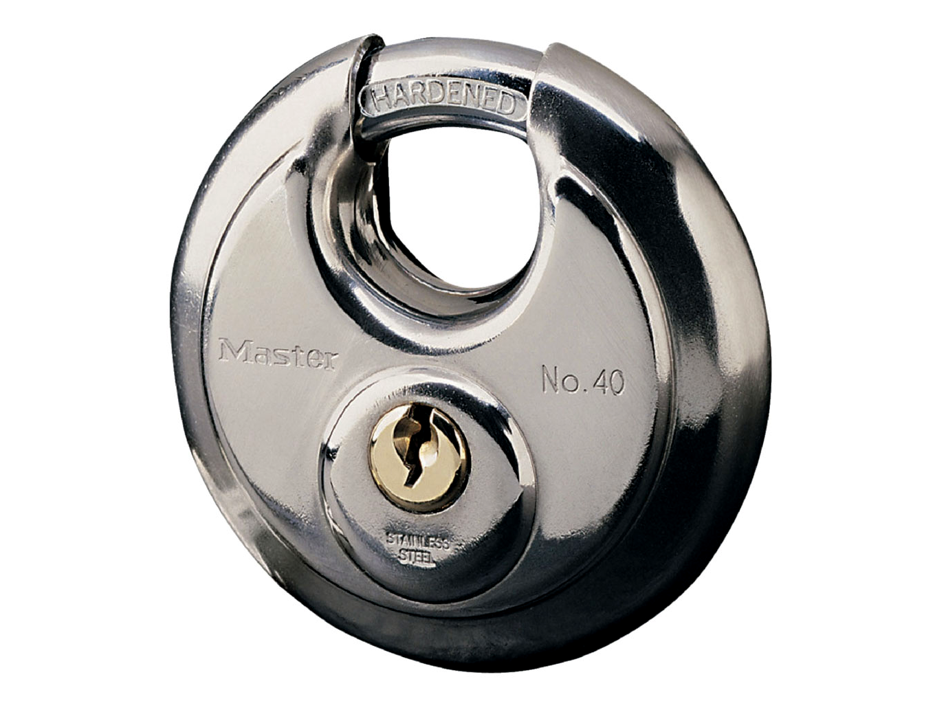 A Master Lock 40EURD Discus Lakat egy 70mm széles rozsdamentes acél testtel rendelkezik, amely biztosítja a maximális szilárdságot, megbízhatóságot és korrózióval szembeni ellenállást. A teljesen burkolt kialakítás minimálisra csökkenti a kapuszár kitettségét és védi a zártestet a csapszeget vágó támadásoktól. A 10mm átmérőjű, 16mm hosszú edzett acél kengyel extra ellenállást biztosít a vágással és fűrészeléssel szemben. A négytüskés henger megnehezíti a zár feltörését, míg a kettős zárócsavaros mechanizmus fokozott védelmet nyújt a feszítés és kalapácsolás ellen.
