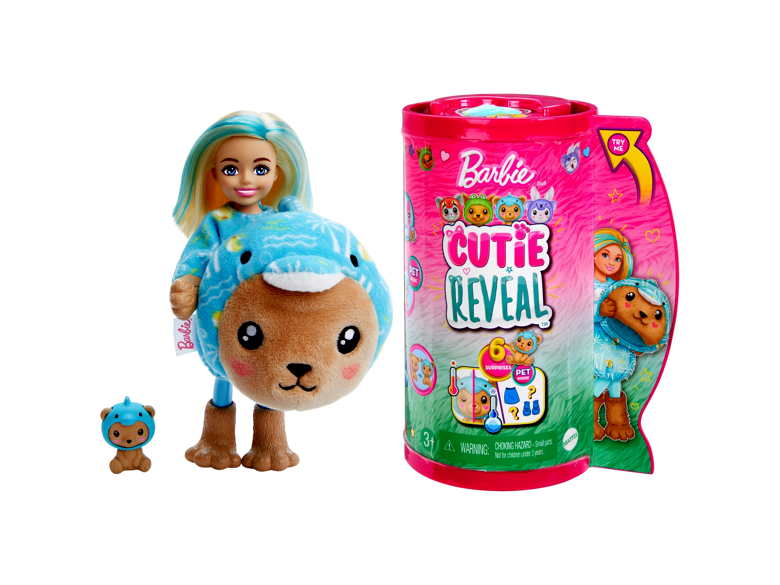Különleges élmény a Barbie Cutie Reveal Chelsea Costume Cuties sorozat babáinak kicsomagolása. Minden plüss jelmez egy Chelsea babát rejt, hosszú, színes hajjal. 6 meglepetés is van, mint például a ruha vagy a jelmezhez passzoló mini kisállat. A jelmez egyszerűen megfordítható, és egy túlméretezett kabát lesz belőle - a jelmezfej a házi kedvence ágyává válik. A hideg víz színváltoztató hatást vált ki a mini kedvencen. A meleg víz ezt megfordítja. Ez a készlet egy delfin plüss jelmezben lévő babát tartalmaz, teddy fejjel és szőke és kék hajjal.
