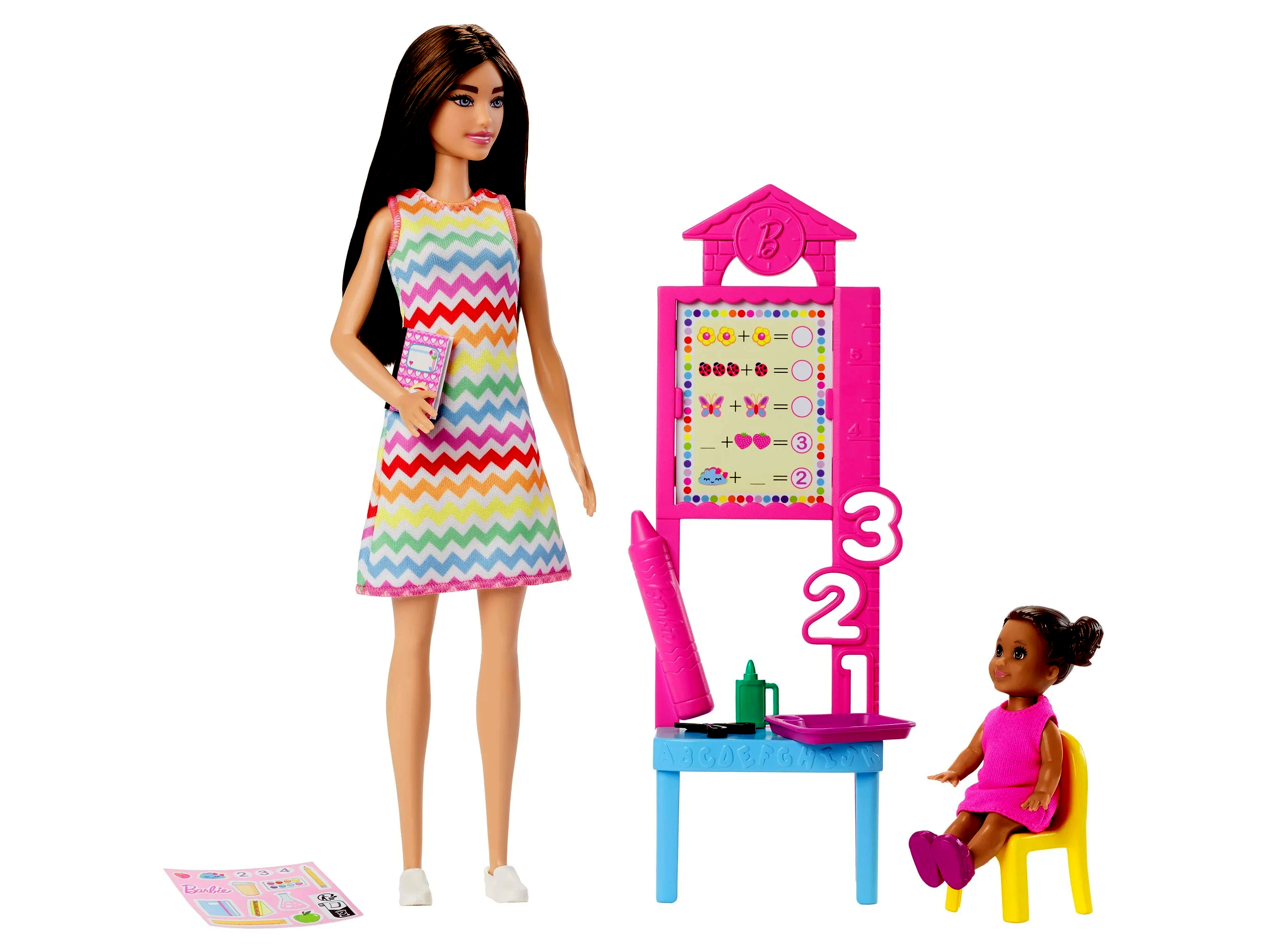 Barbie tanárnő szabályos mintájú ruhát és cipőt visel, amelyek akár le is vehetők. A játékhoz tartozék egy rétegzőív is, amelyet a tanári táblára lehet felragasztani, így még élethűbbé téve a tanári órákat. A kis tanuló Barbie baba egy imádnivaló ruhába bújtatva veheti át az iskolai felszereléseket: iskolatáska, biztonsági olló, ragasztó, jegyzetfüzet és ebédtálca.