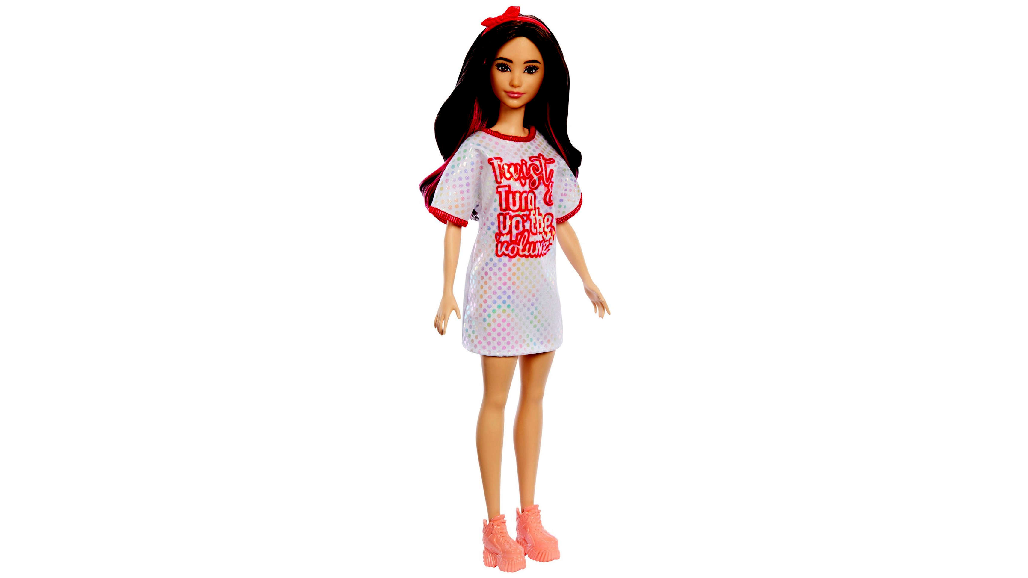 65 év legendás divat és összetéveszthetetlen stílus: Az évforduló alkalmából a Barbie Fashionistas sorozat babái a sokszínűséget ünneplik. Ezek a babák számos lehetőséget kínálnak nagyszerű történetek és menő ruhák létrehozására. Ezzel a sokrétű megjelenéssel a gyerekek megtapasztalhatják, milyen szórakoztató személyiségüket a divaton keresztül kifejezni. Ez a Fashionista baba fehér pólóruhát visel csillogó pöttyökkel. Az ikonikus hálós megjelenésű ruhán a "Twist & Turn Up the Volume!" felirat látható. A ruhát az 1969-es Twist'n Turn megjelenés ihlette, rózsaszín platformcipővel és piros szalaggal egészül ki.