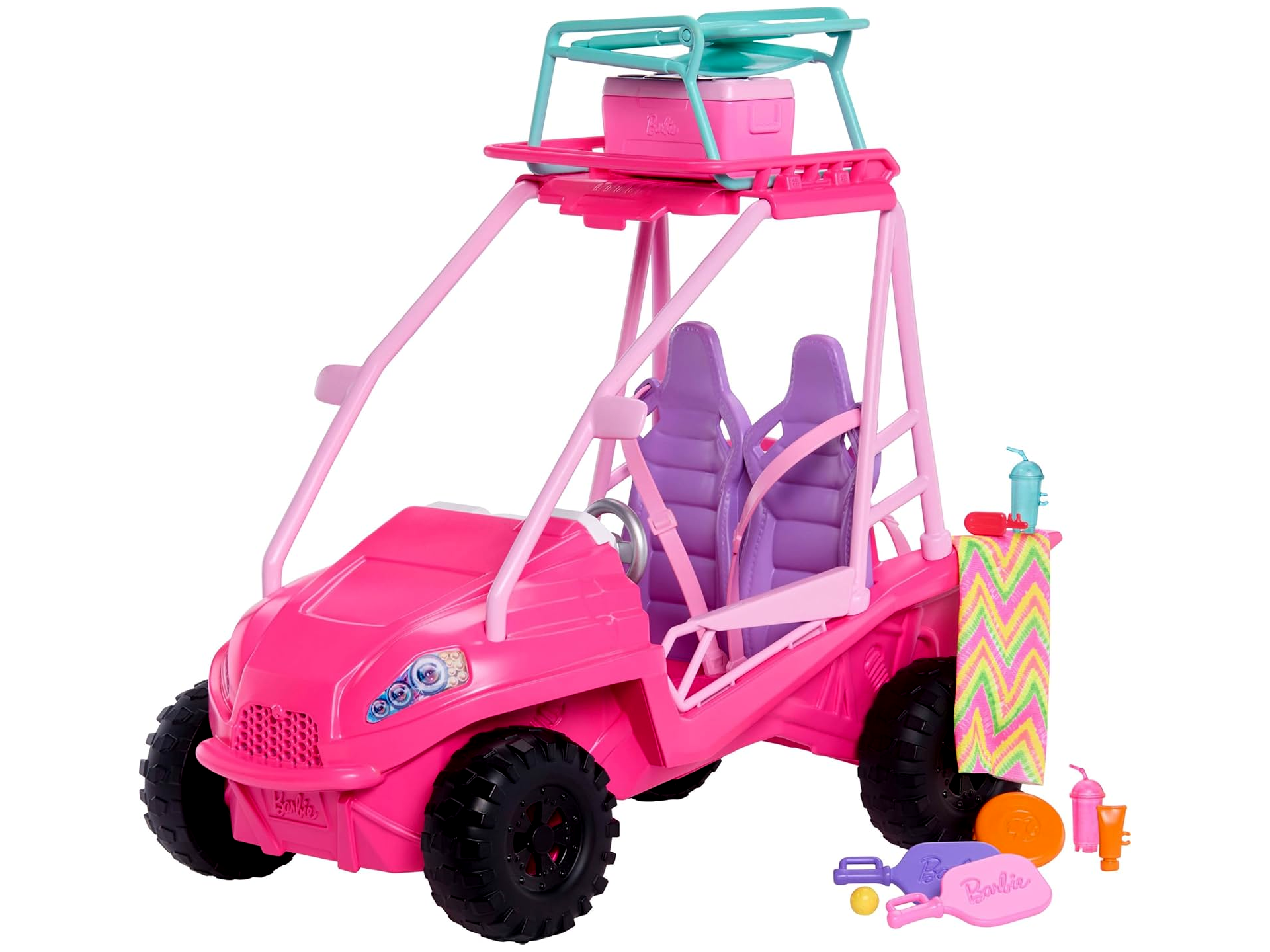 Képzeld el, ahogy a fantáziád révén különféle tengerparti történeteket alkotsz meg ezzel a Barbie Mysteries: Beach Detectives strandjárgány játékkészlettel! A népszerű sorozat ihlette ezt a sportos strandjárgány játékautót, amely forró rózsaszín külsejével, tetőrácsával és akár négy baba (külön megvásárolhatók) számára is helyet biztosítva szállít a partra.