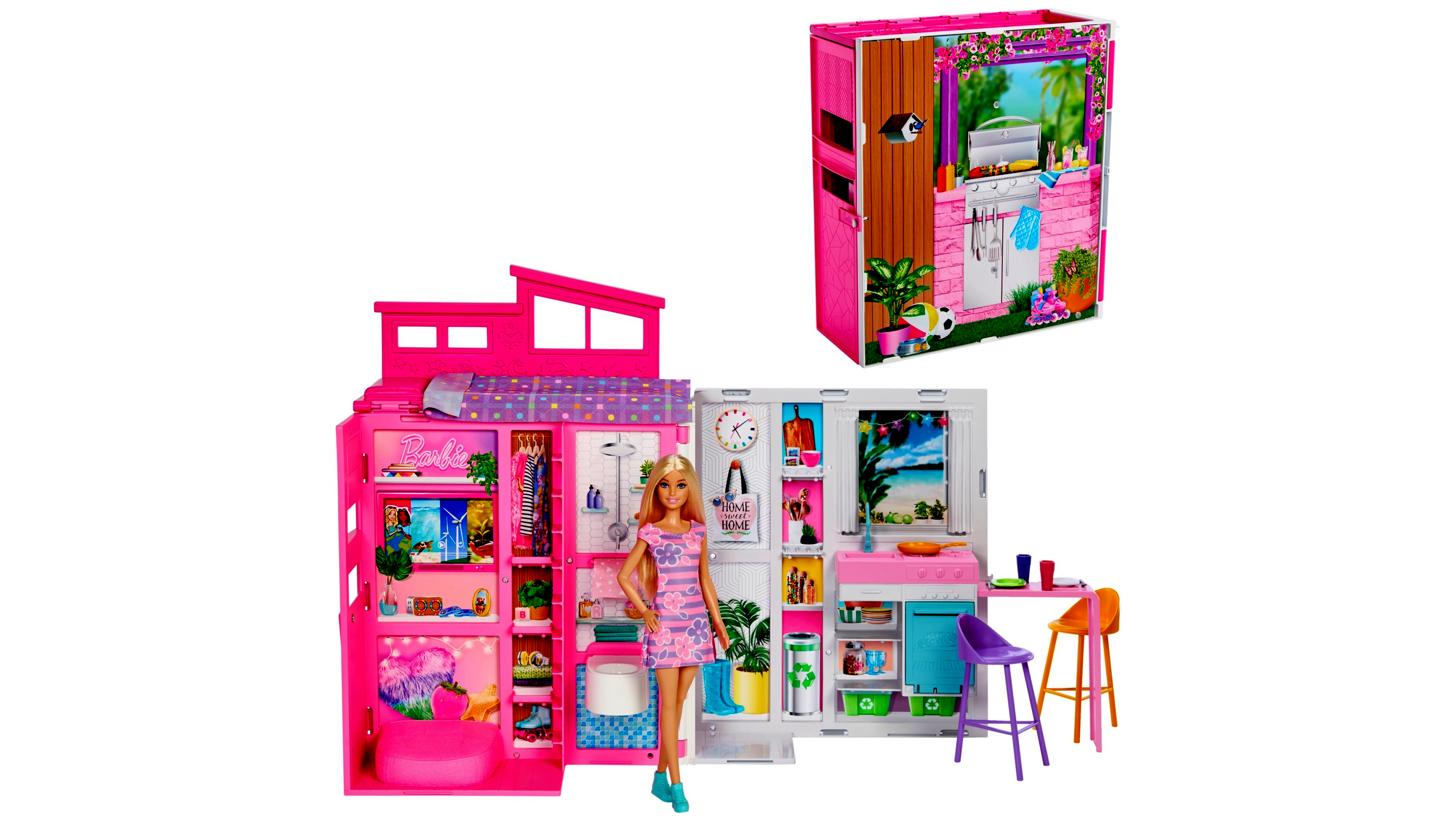 Ez az aranyos Barbie játékkészlet négy játszóteret kínál: egy konyha kihúzható asztallal, egy fürdőszoba, egy hálógaléria és egy hangulatos társalgó. Az olyan kiegészítők, mint az edények, 2 szék, egy törölköző és egy paplan sokféle játéklehetőséget biztosítanak. A mellékelt Barbie baba otthon érzi magát ebben a színes nyaralóban növényekkel, napelemekkel és elektromos jármű képével. A baba rózsaszín és lila ruhát visel virágdíszekkel és türkiz cipővel. Ezért tökéletesen illeszkedik nyaralója színvilágához, amely használaton kívül könnyen összecsukható.