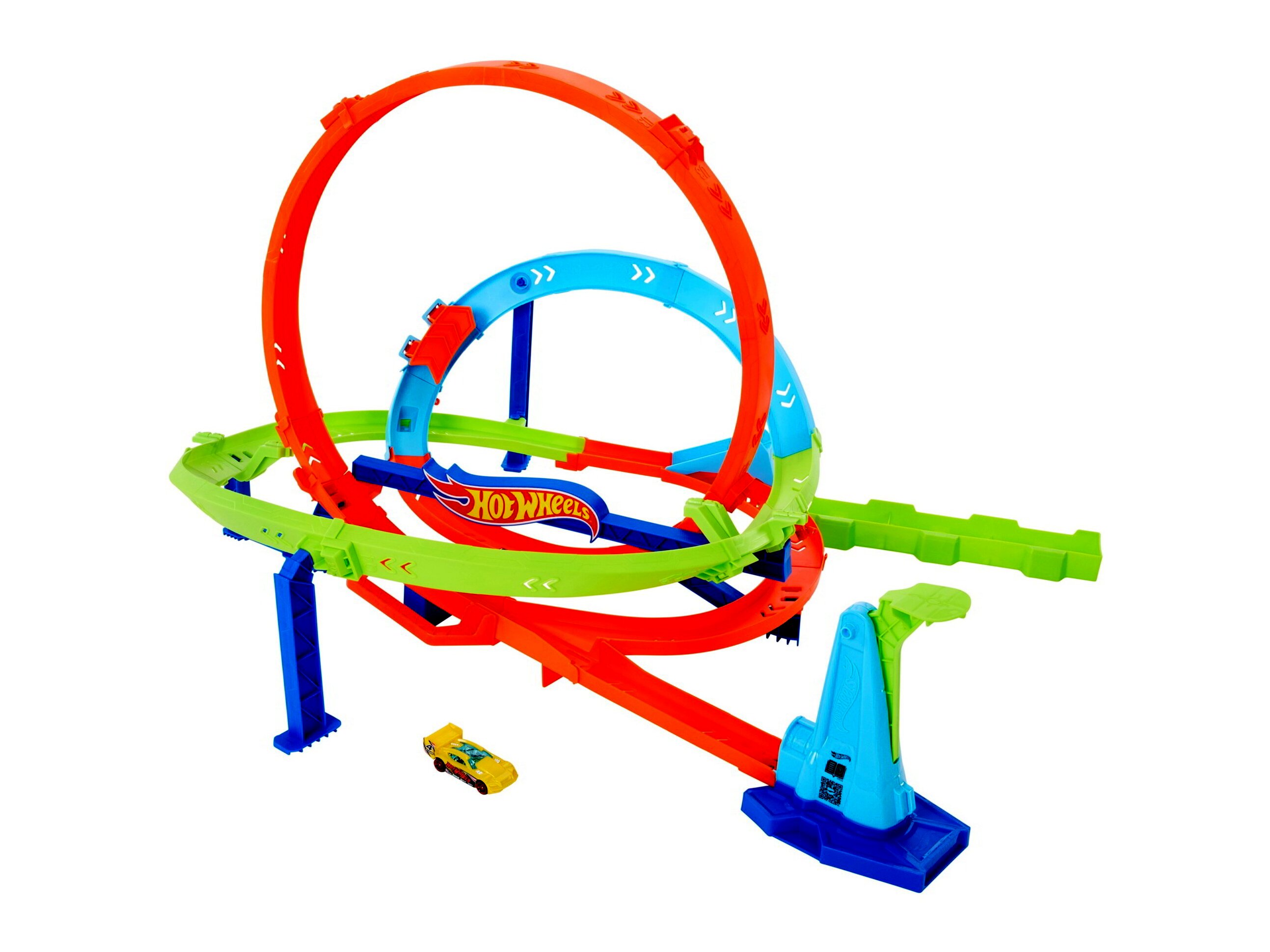 Mindkét lehetőség látványos hurkokon és kanyarokon küldi át az autókat, amelyek lélegzetelállító sebességet biztosítanak. És amikor nem játszol, a pálya egyszerűen összecsukható - vagy magaddal viheted, mert beépített hordozófogantyú is rendelkezésre áll. A szállítmány tartalmaz egy Hot Wheels járművet 1:64 méretarányban